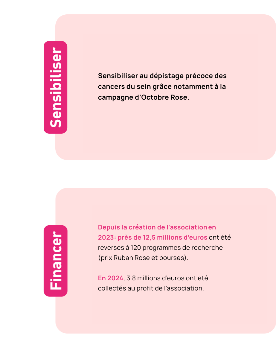 Sinds 2003 zet de vereniging Ruban Rose zich in voor het ondersteunen van onderzoek, het vergroten van het bewustzijn en het bevorderen van vroegtijdige opsporing van borstkanker.