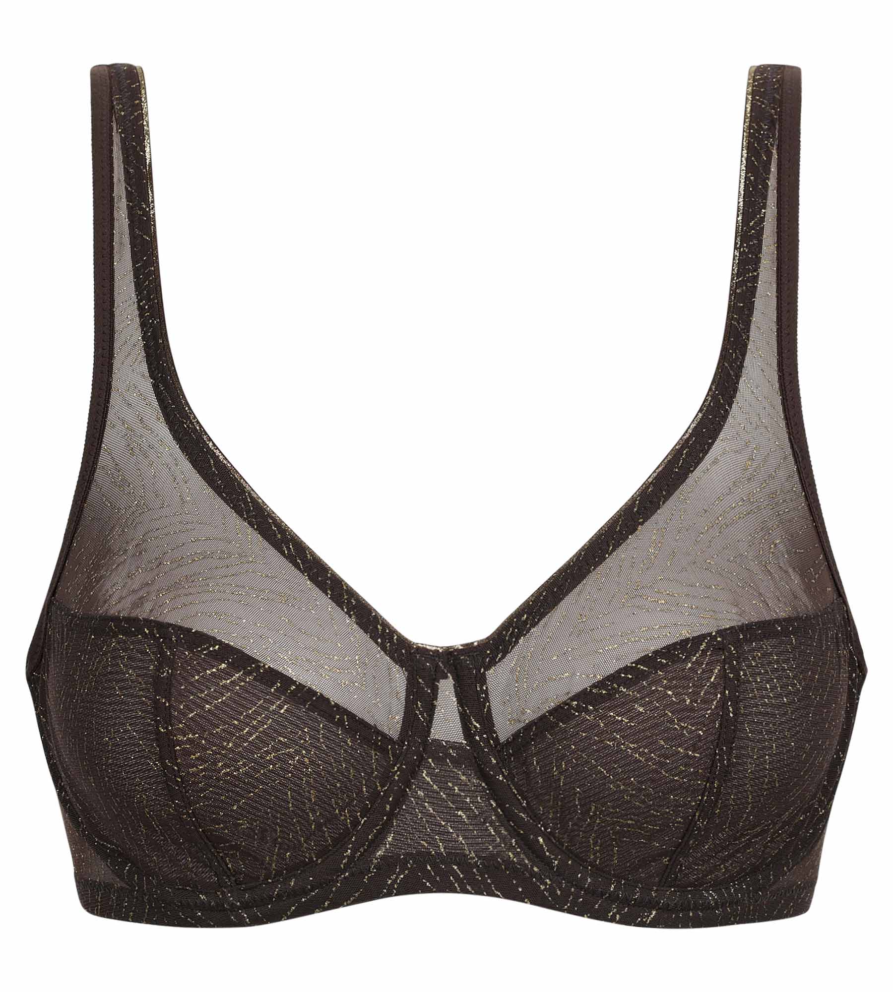 Ontworpen in transparante tule in Chocolade, versierd met gouden zebrastrepen, onthult de in elkaar grijpende beha Dim Generous Limited Edition op subtiele wijze de huid terwijl het een vleugje vrouwelijkheid toevoegt aan je lingerie. De zachte, halfdoorzichtige cups omhelzen de buste zachtjes, terwijl de brede beugel onderaan met ronde draden zorgt voor optimale ondersteuning. Met zijn platte, gouden afwerking garandeert de Dim Generous sheer beha absoluut comfort en een unieke stijl, elke dag opnieuw.