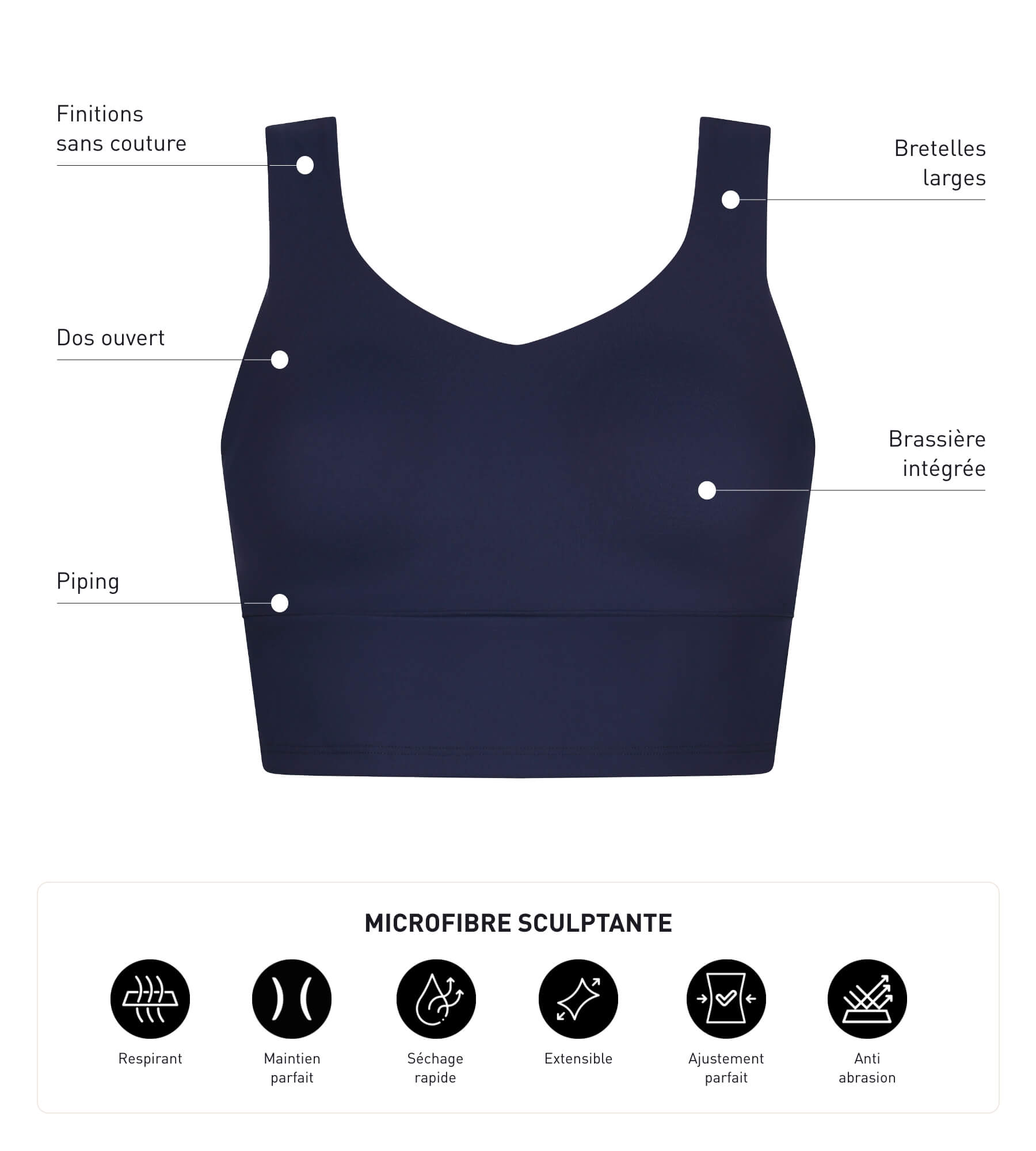 De Dim Move sportbeha is ideaal tijdens trainingen of zeer actieve dagen en is technisch zonder stijl op te offeren. De hoogwaardige stof voert vocht af, beperkt schuren en blijft comfortabel, zelfs tijdens het sporten. De binnenmanchet zorgt voor een vloeiende pasvorm, terwijl de lange snit het silhouet mooi structureert. Ideaal voor fitness, yoga of meer dynamische sessies, het zal snel een essentieel onderdeel van je sportgarderobe worden.