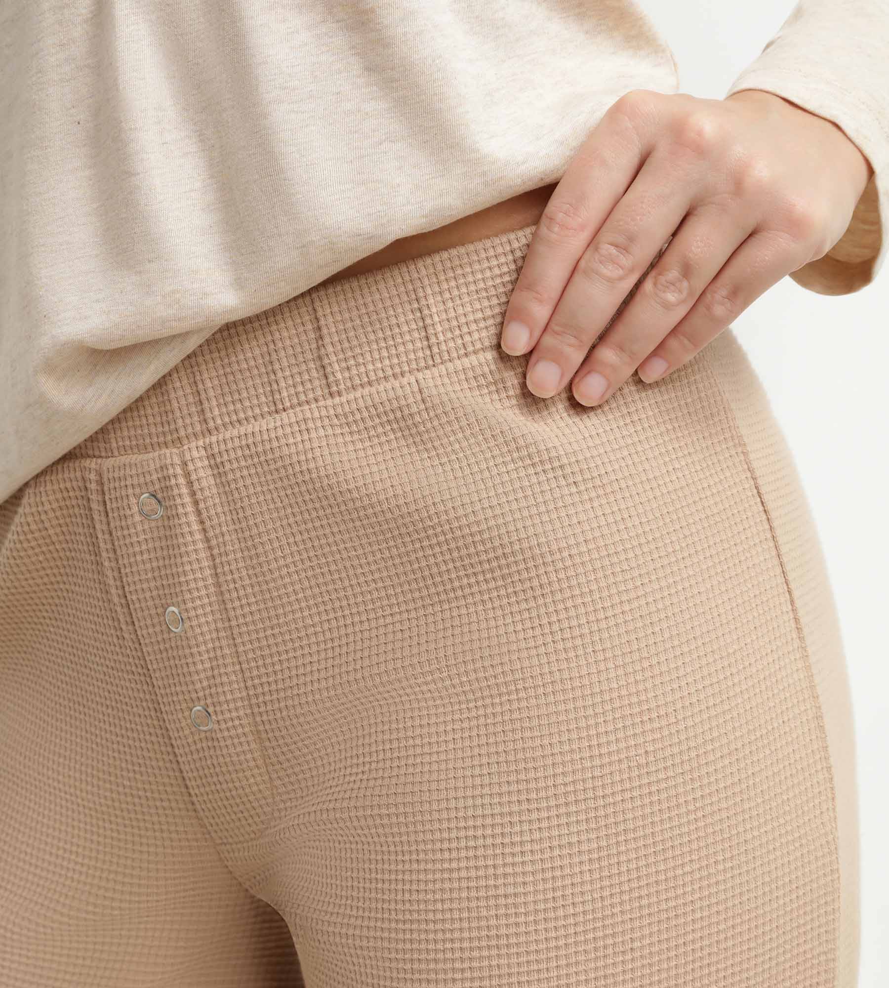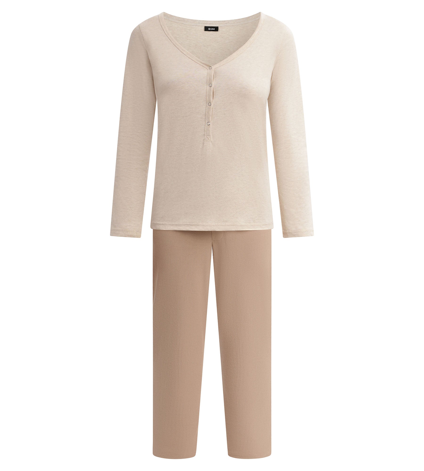 Perfect voor rustige ochtenden en ontspannen avonden, deze Dim damespyjama is chique en eenvoudig. De top van beige jersey voegt helderheid toe, terwijl de onderkant van Taupe Brown het geheel verankert in een natuurlijk, eigentijds palet. De Serafino-snit met V-hals en knopen geeft een casual-chique uitstraling, terwijl de rechte broek met lage taille comfortabel is zonder beperkend aan te voelen. Een duo van kleuren dat is ontworpen voor elke cocooning stemming zonder stijl op te offeren. De Cosy Time collectie is een tijdloze, gemakkelijk te dragen basic!