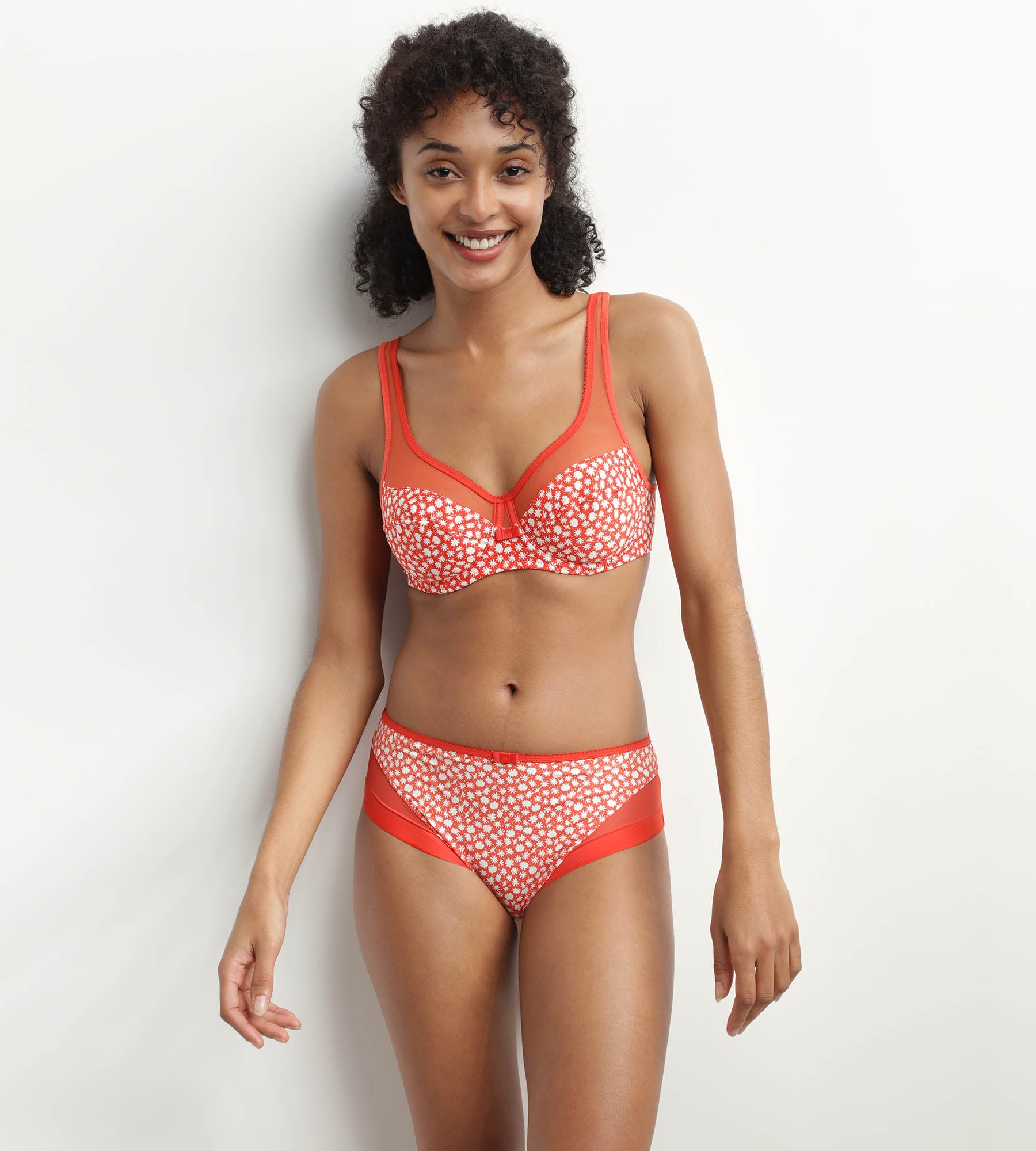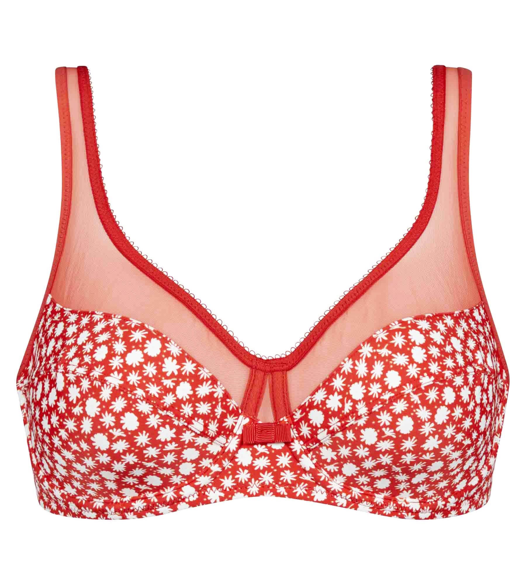 Combineer comfort en vrouwelijkheid met de Dim Generous beugelbeha in rode microvezel met bloemen en transparante tule!