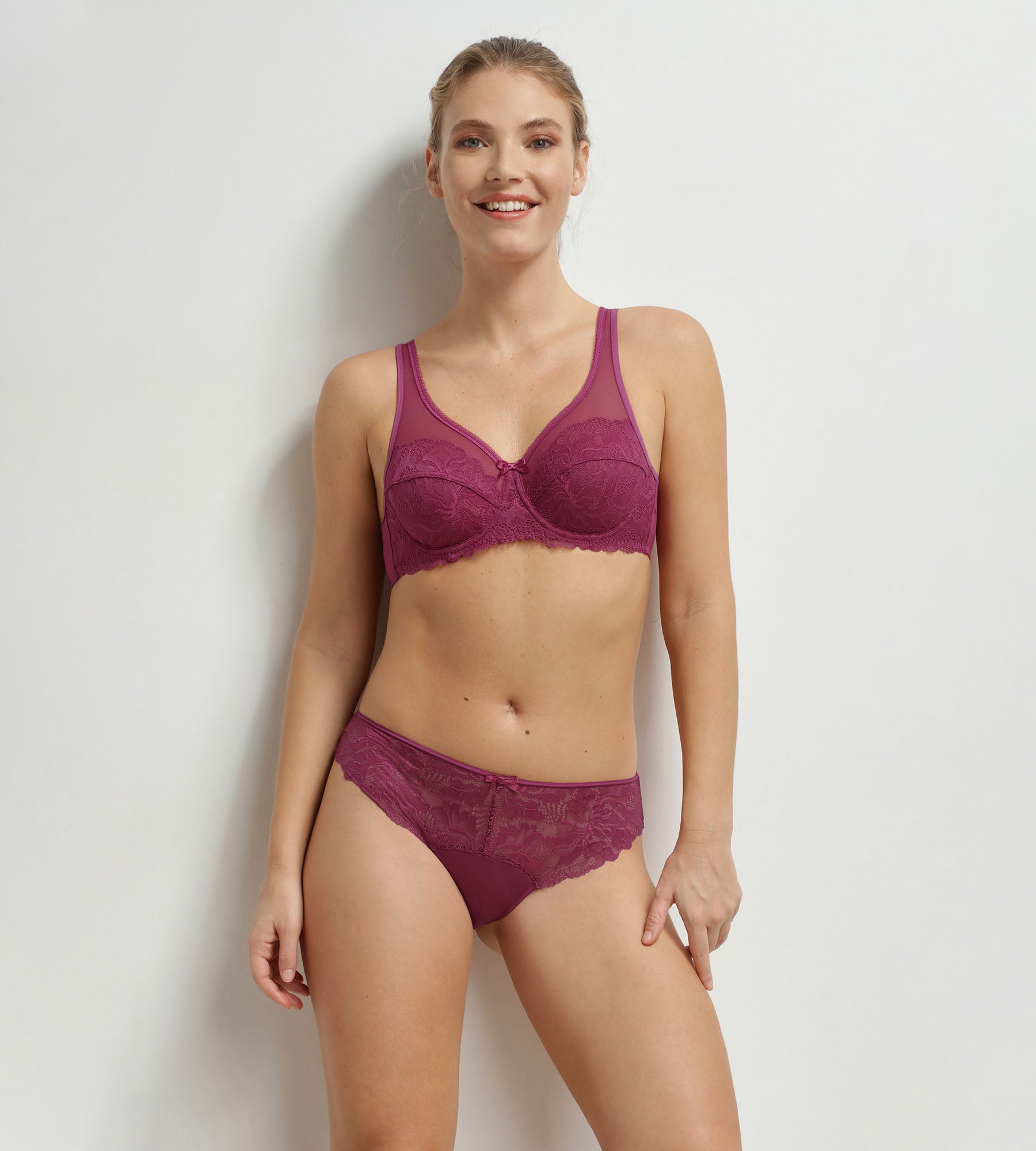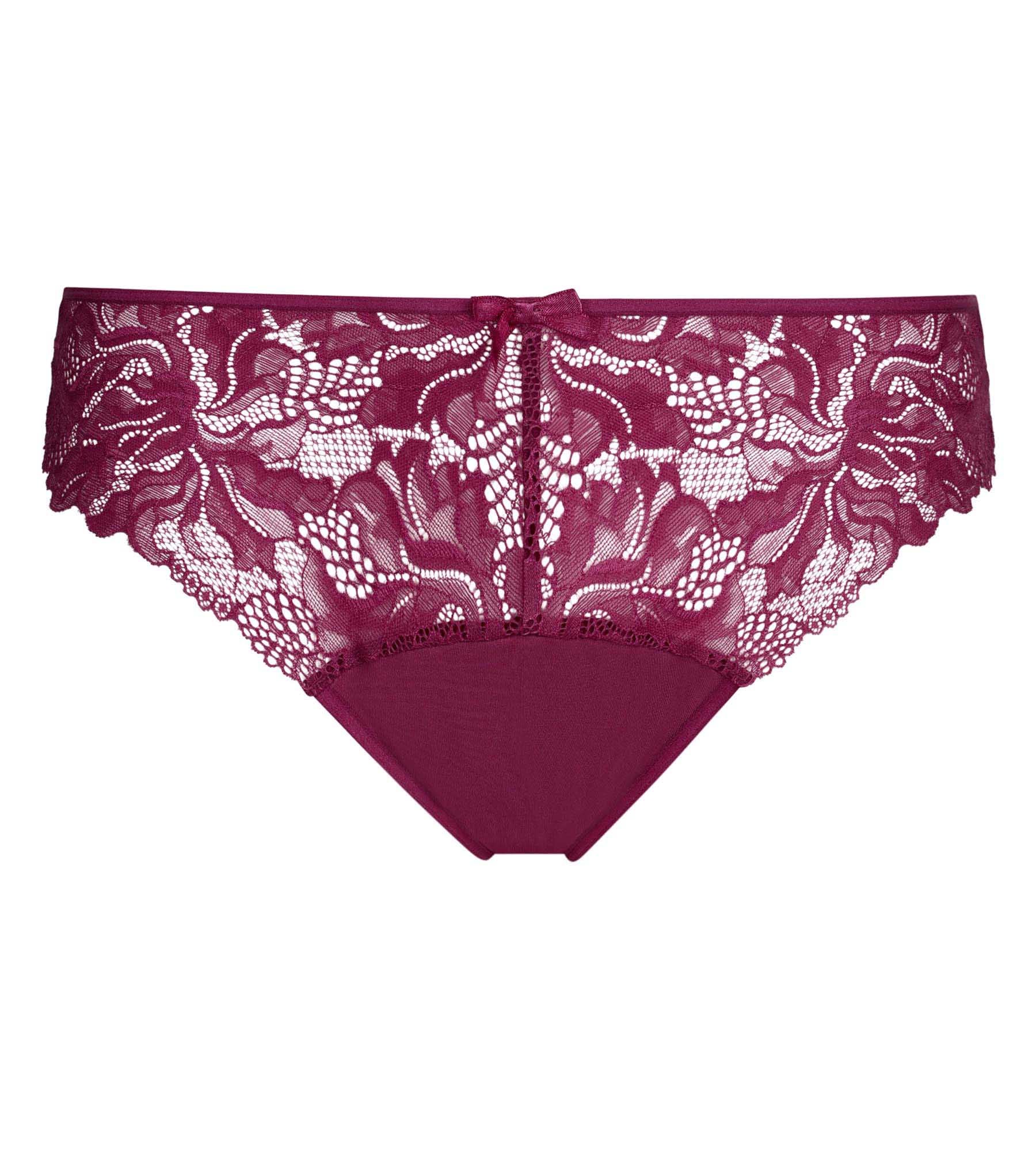De elegante en comfortabele Dim Generous Essentiel damesslip in Sangria Red kant en microvezel verbetert het figuur met zachtheid en luchtigheid.