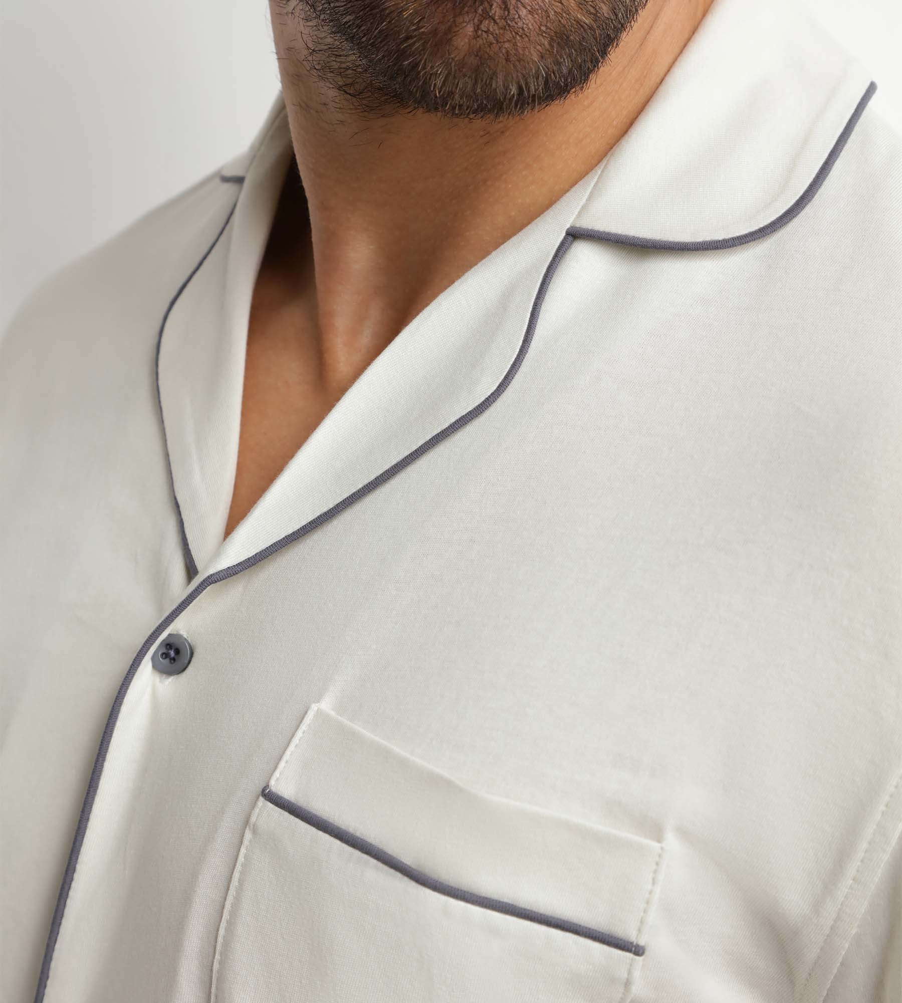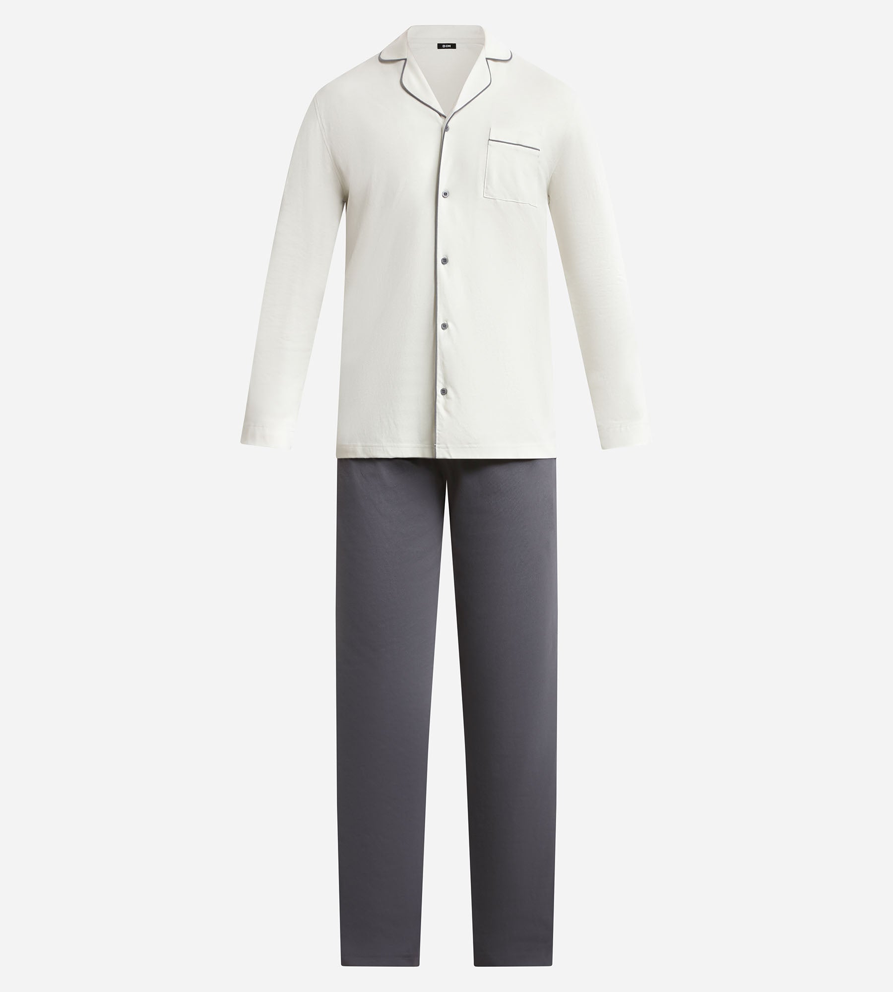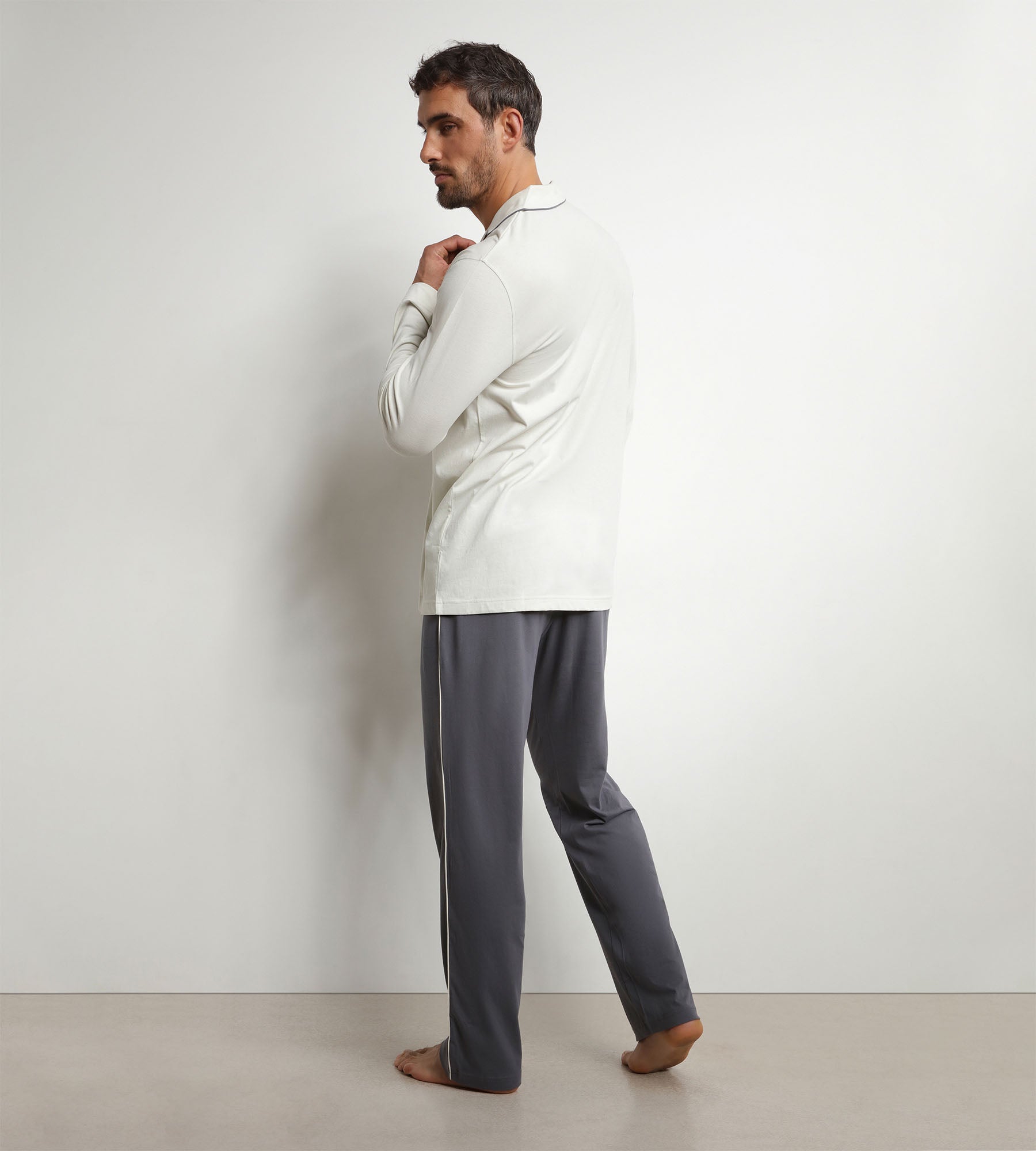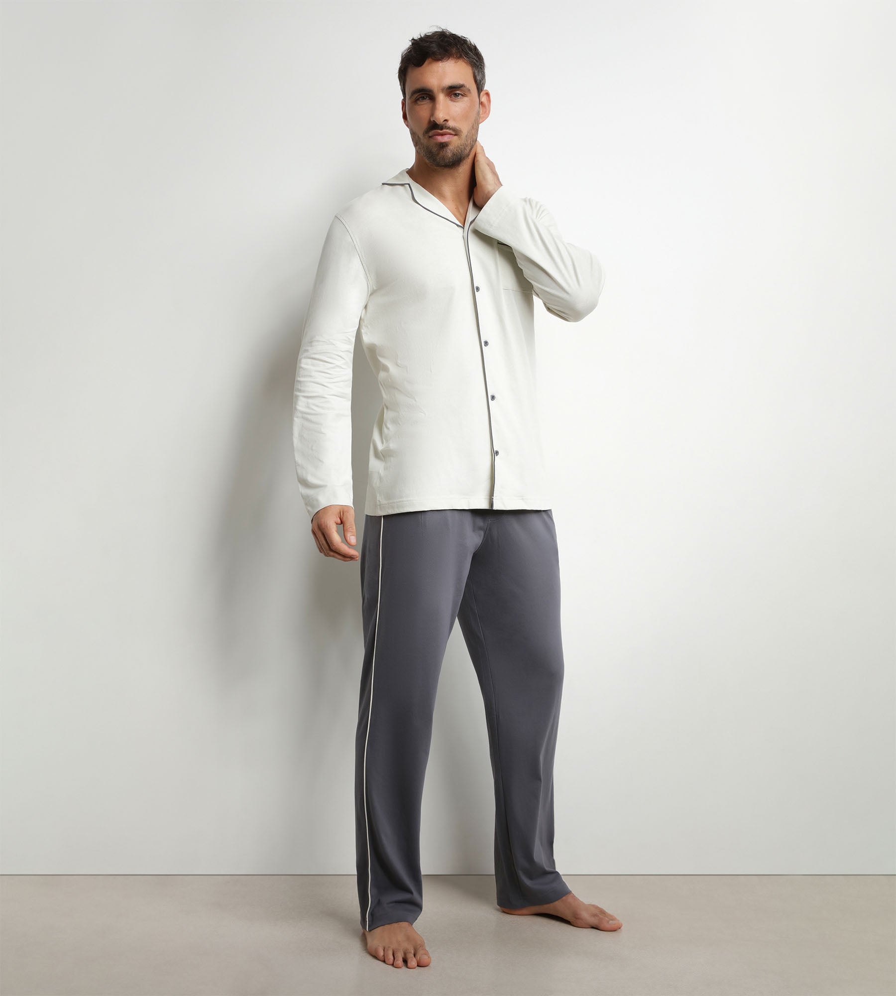 Bij deze pyjamaset voor heren van Dim Nightwear draait alles om gecontroleerd comfort. Deze herenpyjama van Dim bestaat uit een lichtgrijs shirt van jersey met contrasterende biezen en een vloeiende broek. Hij leent de codes van confectiekleding en voegt een echt vleugje elegantie toe. De platte afwerking, bedekte tailleband en steekzakken maken deze herenpyjama bijzonder praktisch en altijd comfortabel. Het donkergrijs, hier gekozen in een diepe, sobere tint, zorgt voor een tijdloze stijl die nooit slijt. De Dim herenpyjama is ideaal voor wie nette, nette nachtkleding wil, ver van al te casual outfits.