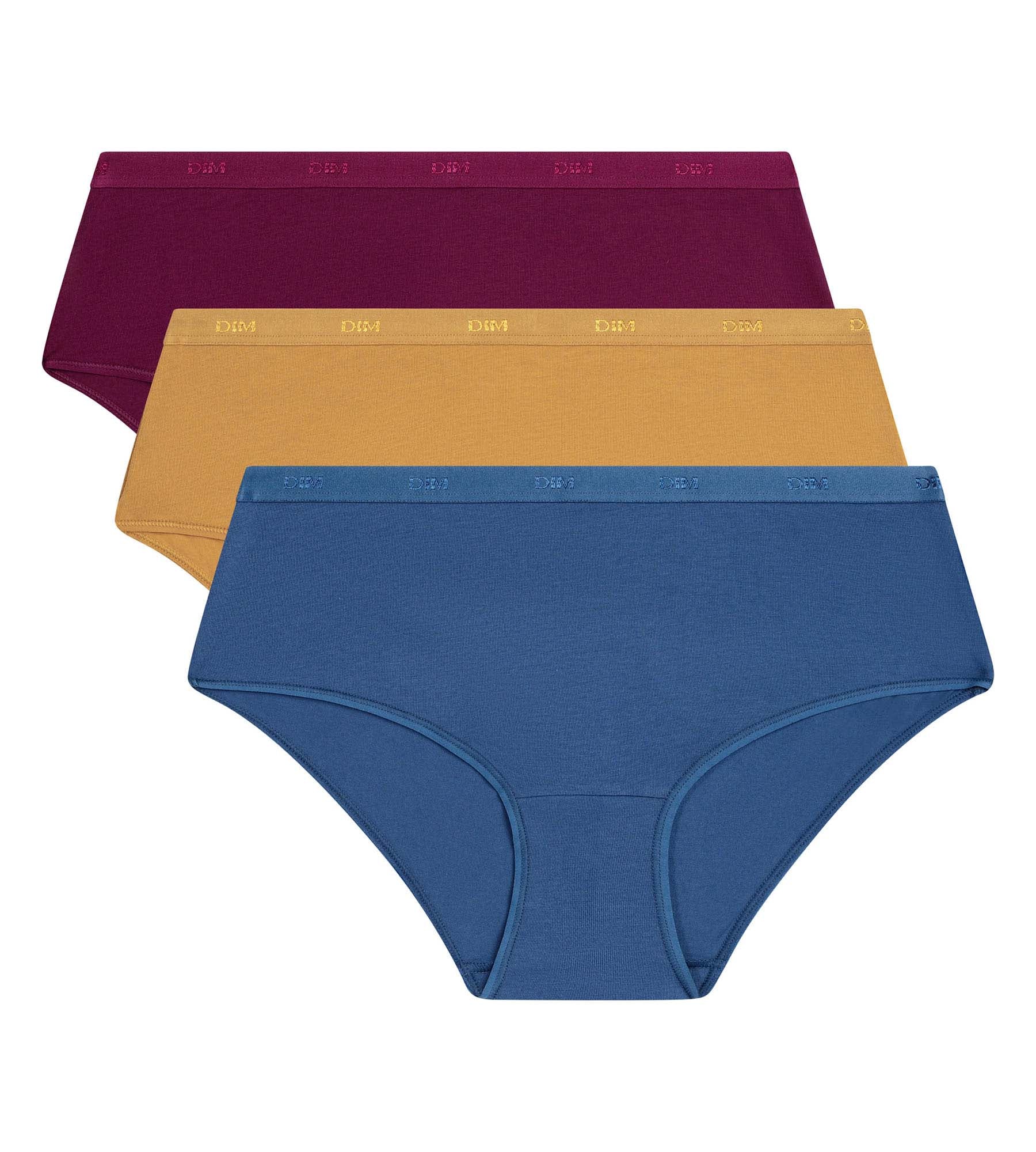 Verlevendig je essentials met het Les Pockets EcoDim dames 3-pack boxers in marineblauw en goudgeel stretchkatoen.
