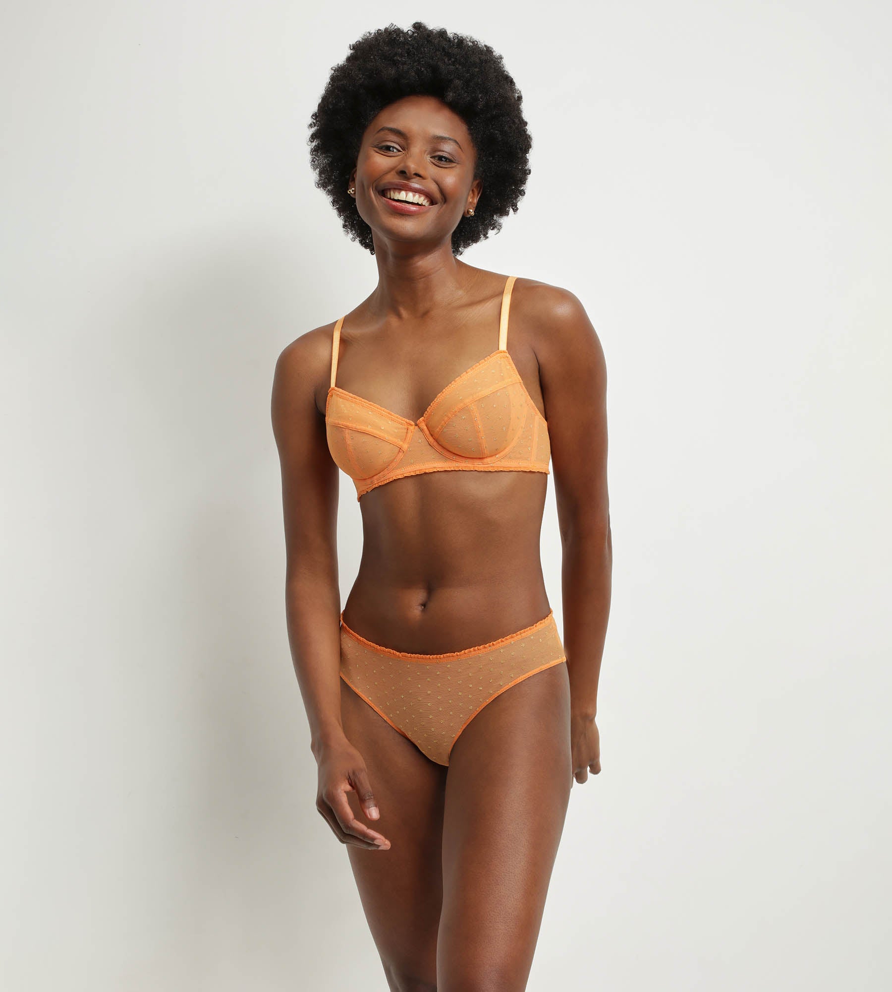 Ga subtiel en vitaal de dag door dankzij de damesslip Shiny Mesh in levendige oranje tint! De luchtige, transparante en elastische afwerking geven je een ongeëvenaard comfort, terwijl de lurex polkadots je lingerie een sprankelend tintje geven. Met zijn glamoureuze en toch casual ontwerp is de Shiny Mesh slip voor dames perfect om je in elke situatie verleidelijk en comfortabel te voelen.