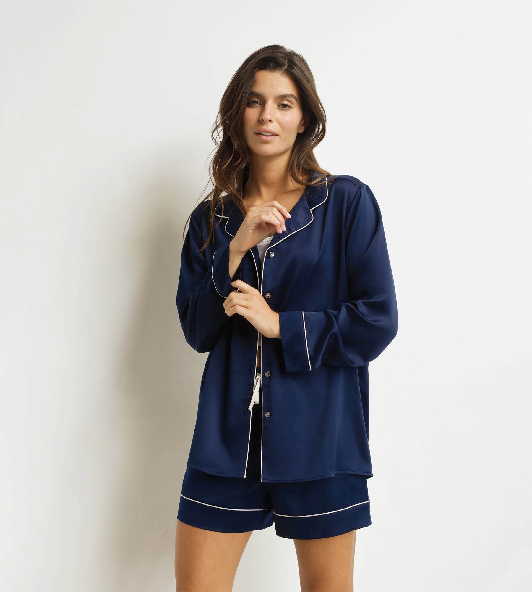 Licht en geraffineerd, kies voor de Dim Don’t Disturb Midnight Blue Satin Short Pajamas voor dames, voor nachten van rêve!