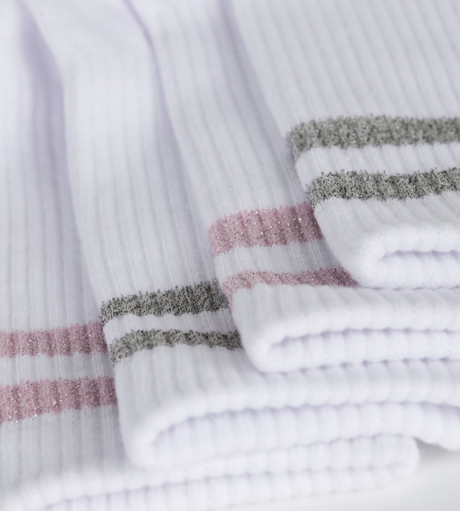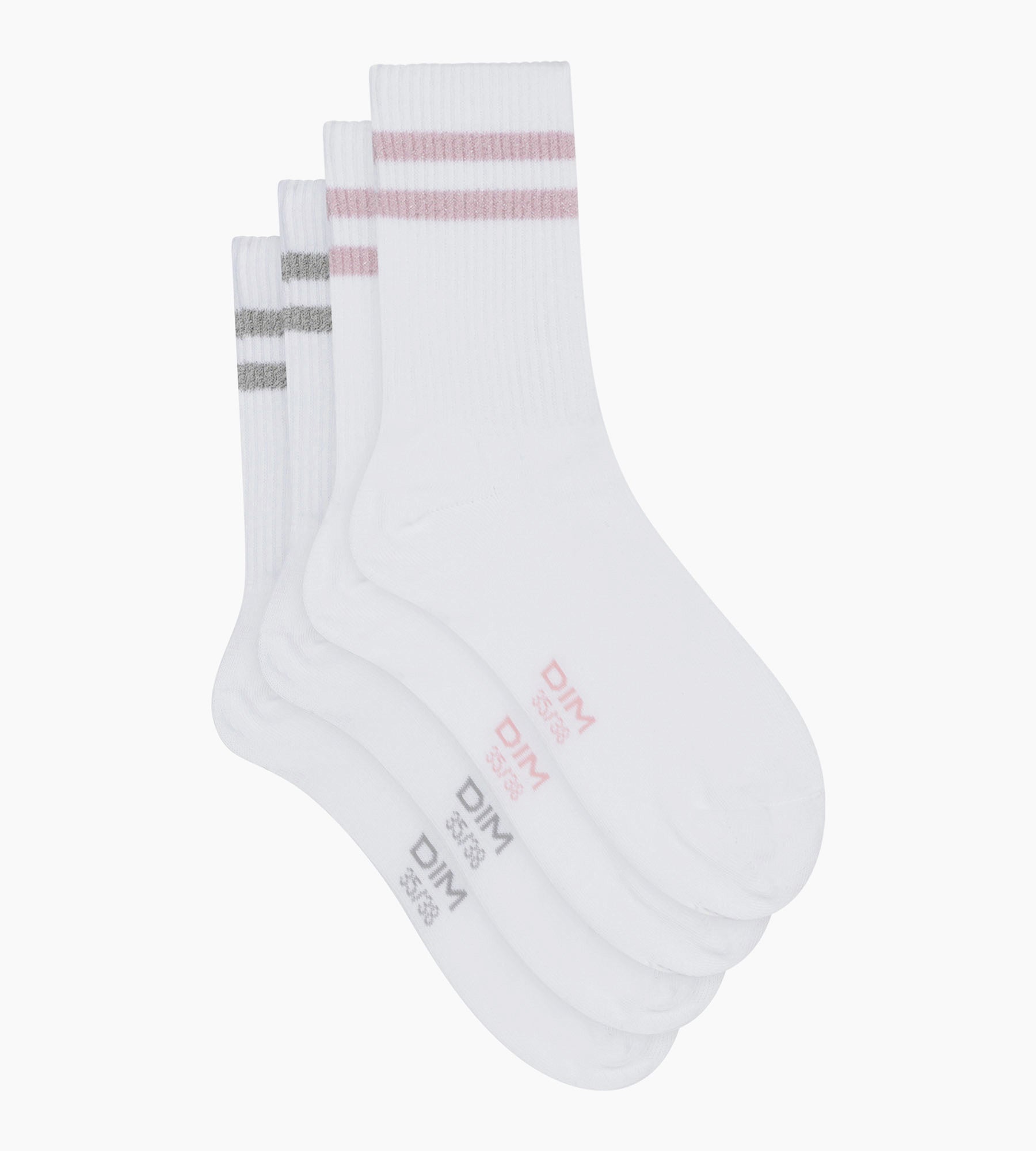 Een sportieve look met een vleugje sprankeling, de Dim Mode set van 2 paar damessokken in wit katoen en roze/zilveren lurex herontdekken de casual stijl met elegantie.