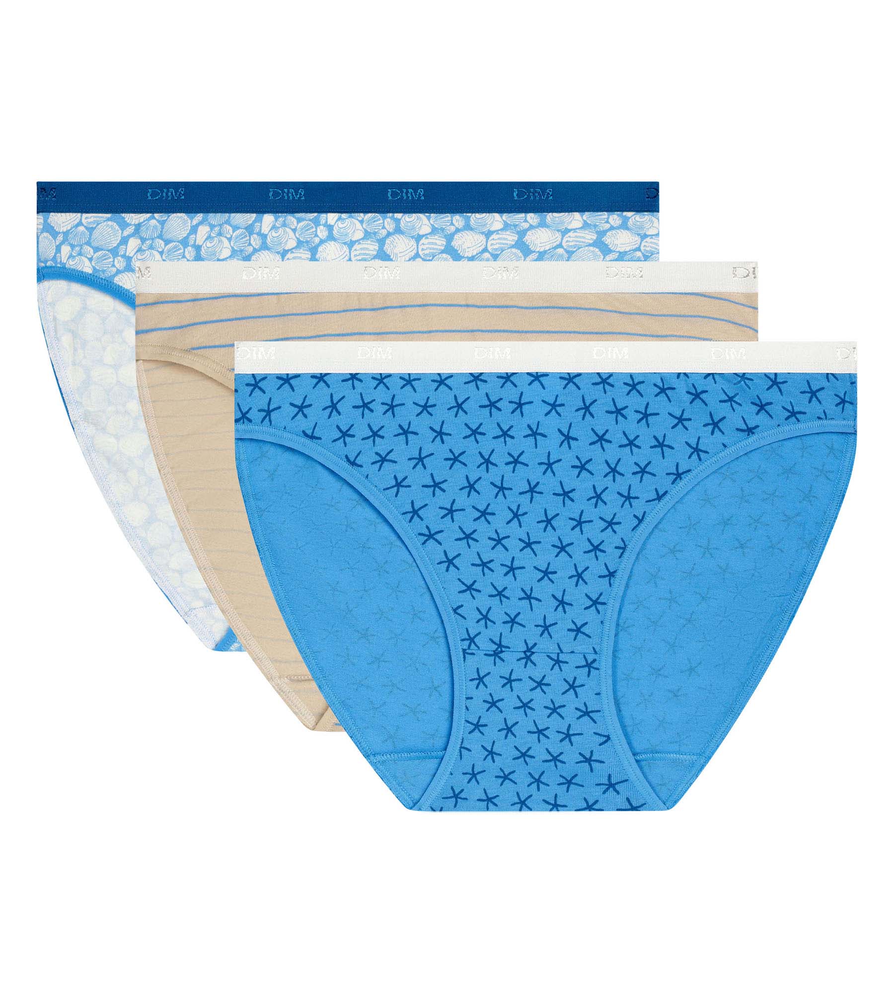 Laat je inspireren door de kleuren van de oceaan met de Les Pockets set van 3 stretch katoenen damesslips van Dim.