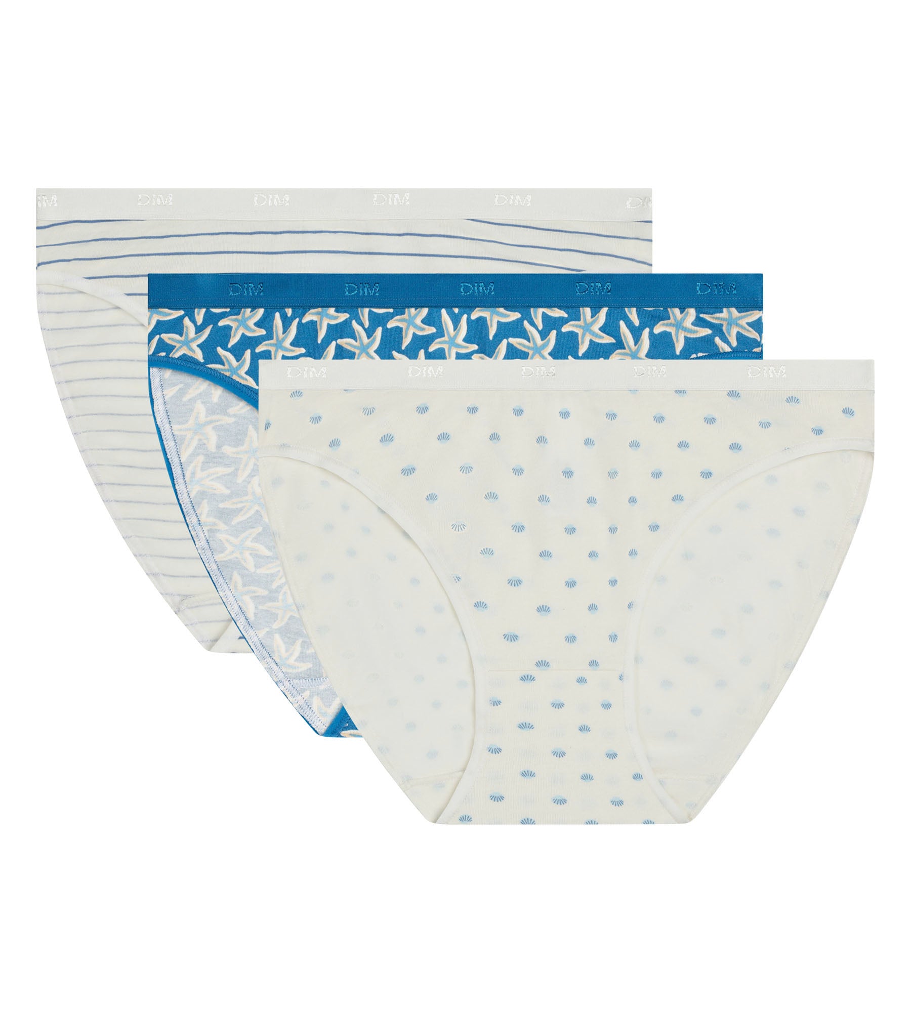 Ga voor een kustlook met de set van 3 dames slips van stretchkatoen Les Pockets van Dim, in op de oceaan geïnspireerde kleuren en patronen.