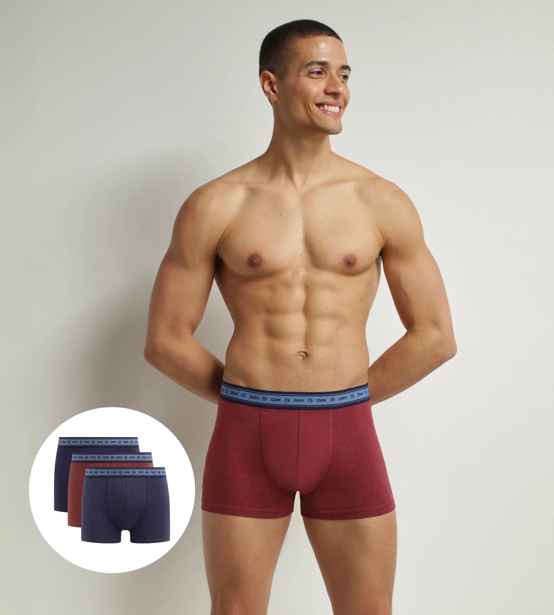 De Dim Good heren boxershorts bestaan uit 2 Denim Blue boxershorts en een Wine Red boxer en geven je een zeer mannelijke look! Met hun zachte, rekbare stof zullen je boxershorts van biologisch katoen je elke dag comfortabel houden. Dankzij Dim's kenmerkende zwarte elastische tailleband en de naden aan de voorkant blijft je ondergoed stijlvol op zijn plaats zitten.