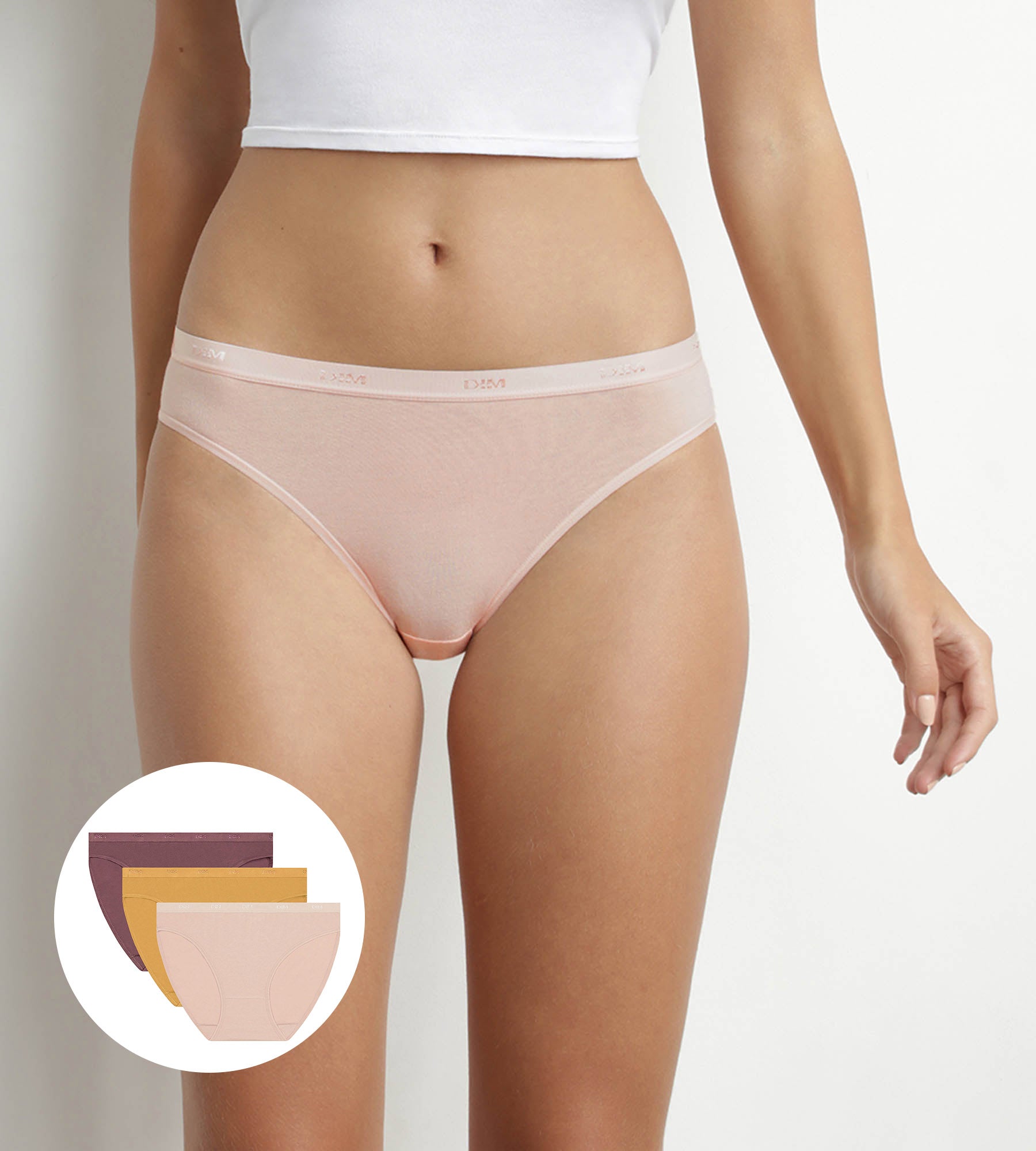 Kies voor een stralende look met de Les Pockets EcoDim set van 3 stretch katoenen damesslips in Geel, Roze en Bruin!