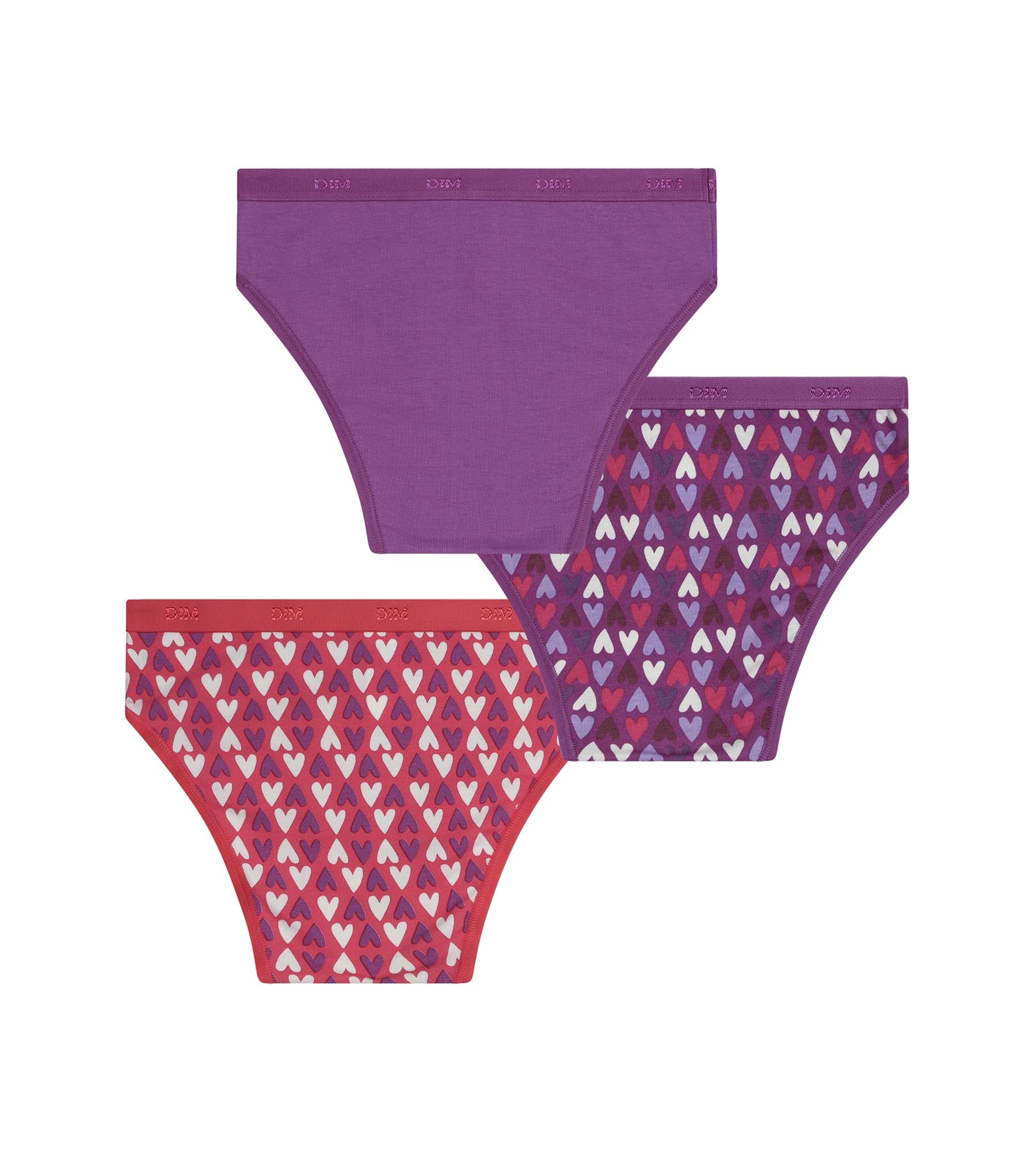 Voeg een dosis vrolijkheid toe aan haar essentials met het Les Pockets meisjes 3-pack stretch katoenen slipje in paars en rood met hartjesprint.