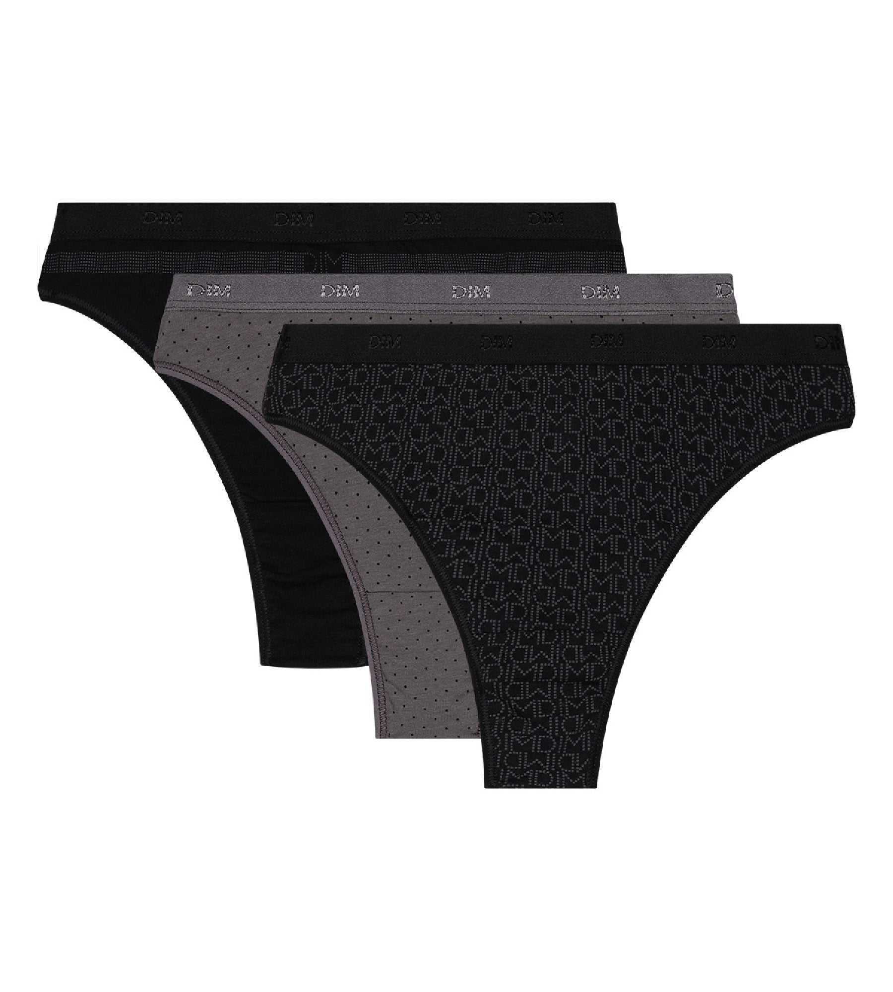 - 1 grijze string met zwarte stippen, 1 zwarte string met DIM-print en 1 zwarte string met DIM-schrift onder de tailleband