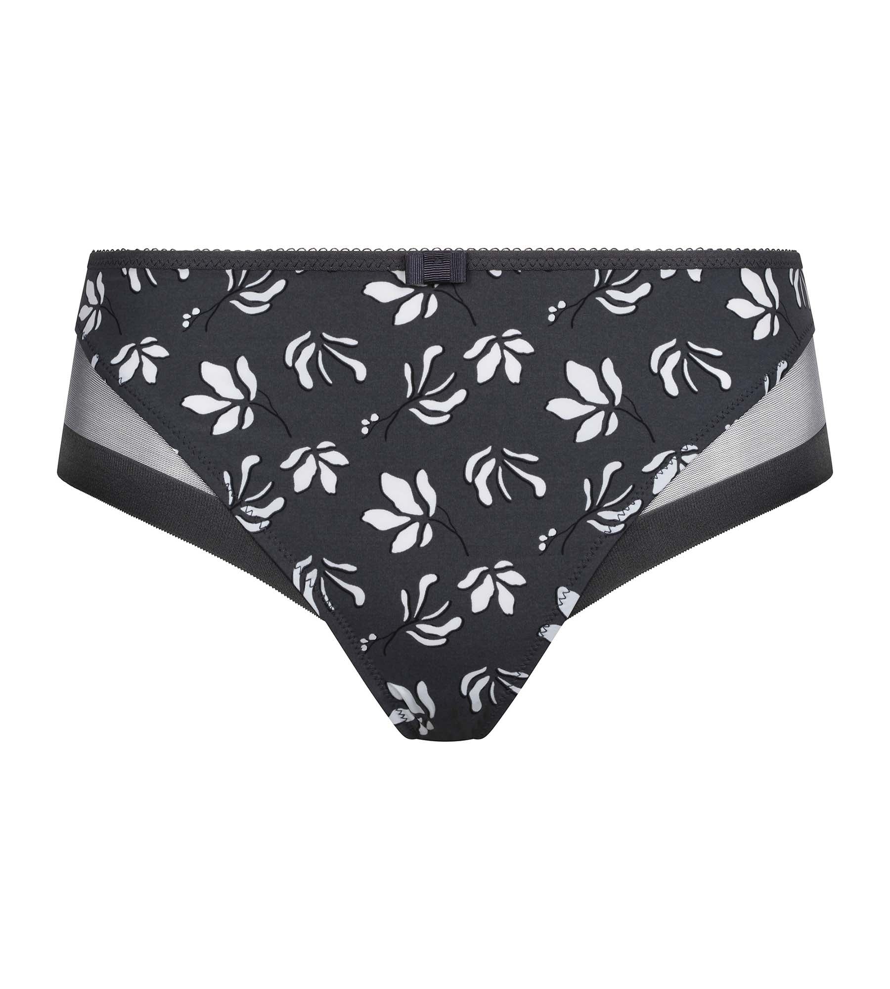 Kies voor een verfijnde, moderne look de Generous Essentiel damesslips van antraciet microvezel en tule, met blauwe bloemmotieven!