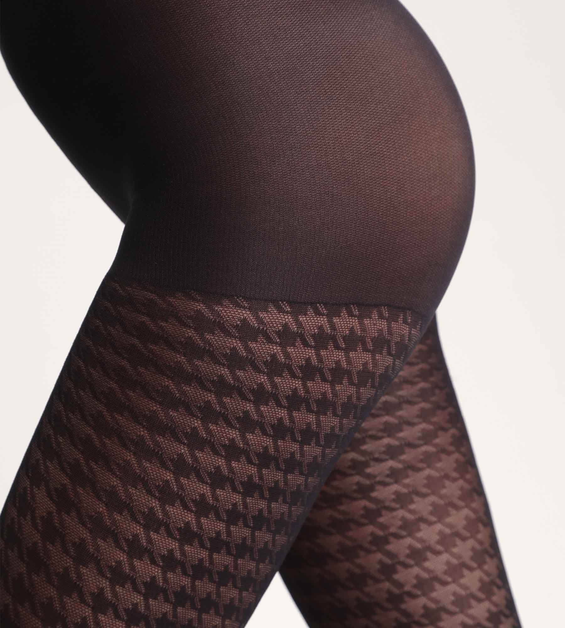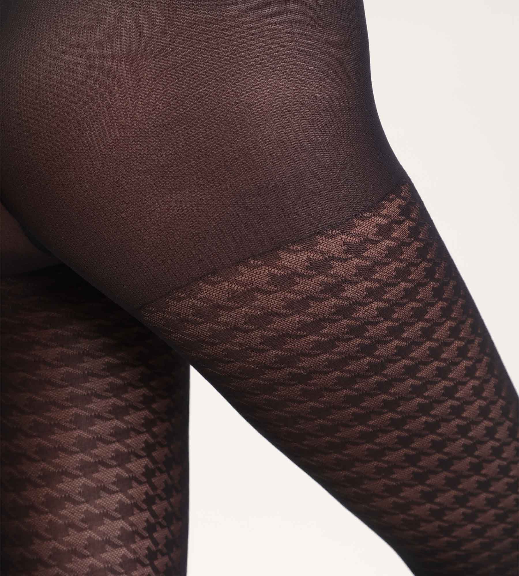 Straal een couturelook uit met de semi-opaque fantasiepanty voor dames van DIM Style in een zwart houndstooth-patroon.