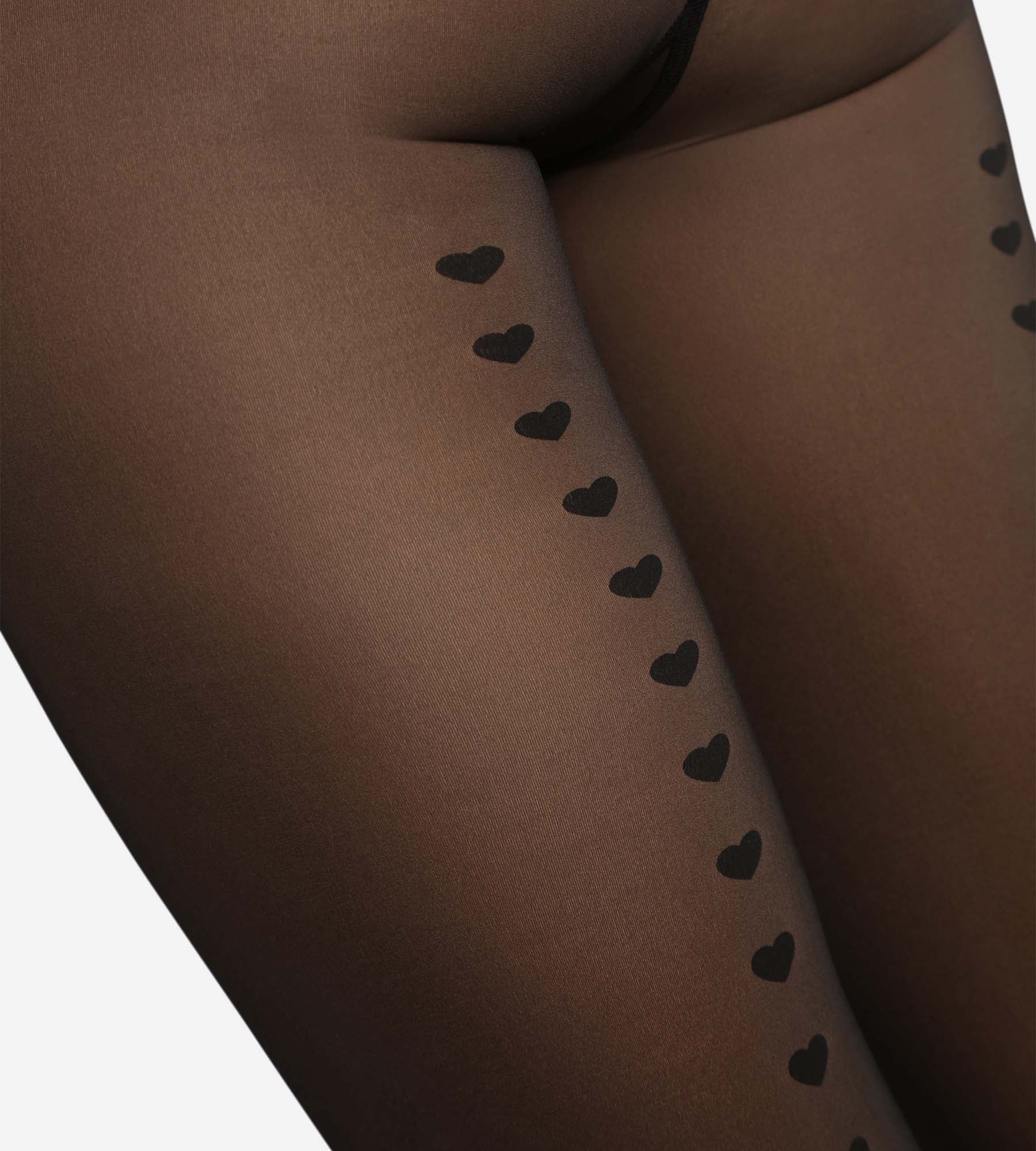 Bekijk de zwarte DIM Thermo panty: een doorschijnende sluier met hartjes en een warme binnenkant om stijl en bescherming te combineren.
