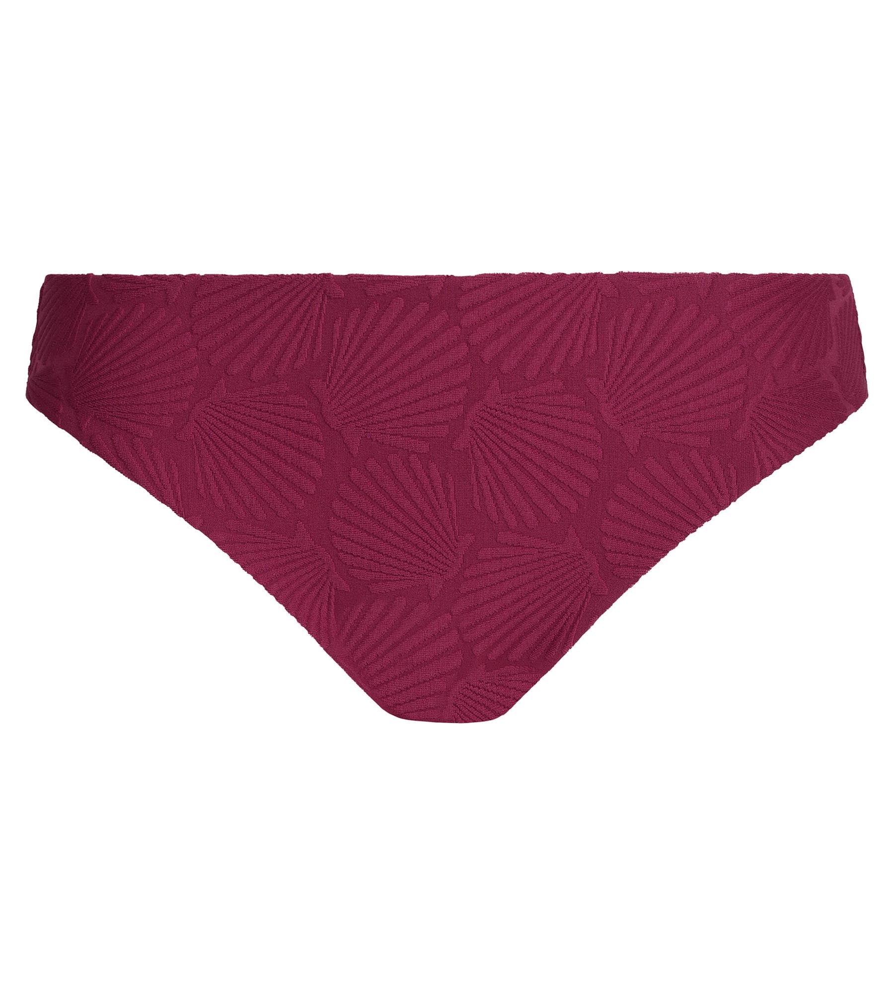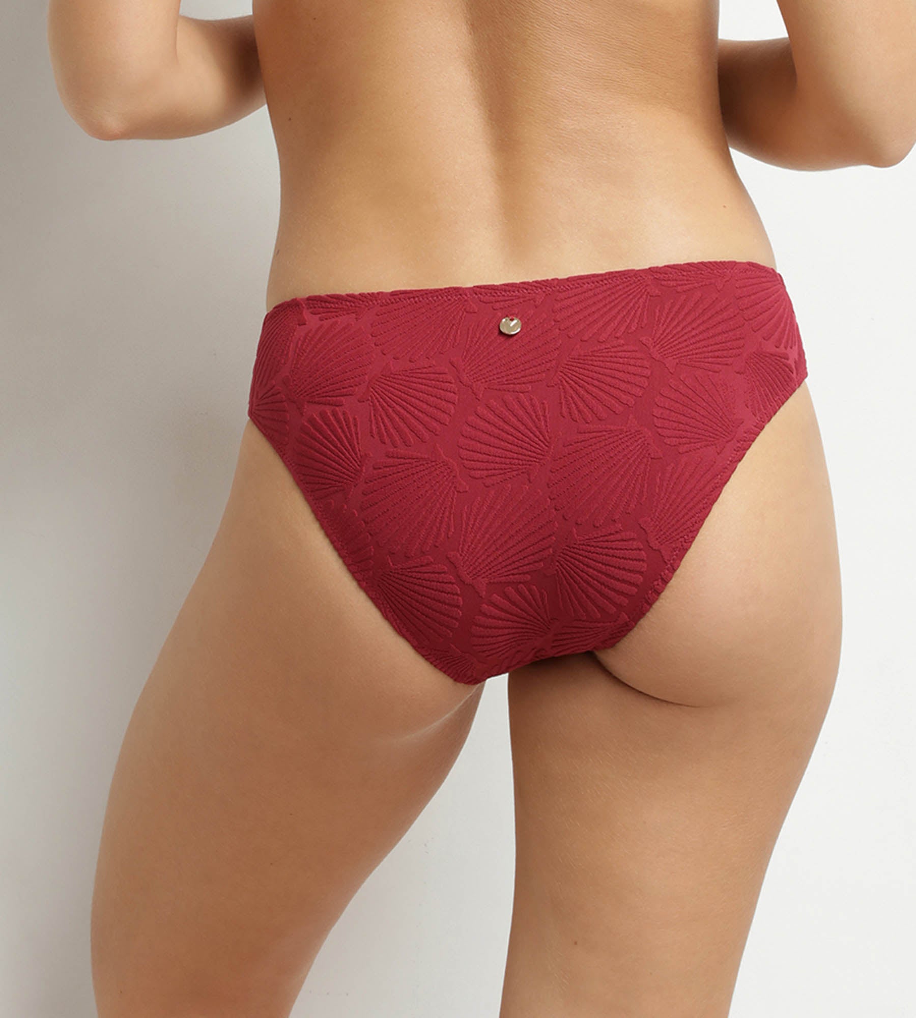 Avec son allure à la fois graphique et intemporelle, cette culotte de maillot de bain femme flatte naturellement les formes. Sa taille mi-haute structure la silhouette tout en offrant une tenue souple, parfaite pour se sentir à l’aise du matin au soir. Le jacquard coquillage ajoute un relief discret et ludique au coloris rouge profond. Les touches dorées signent le look avec finesse et font de ce bas de maillot de bain femme un essentiel chic, pensé pour durer été après été.