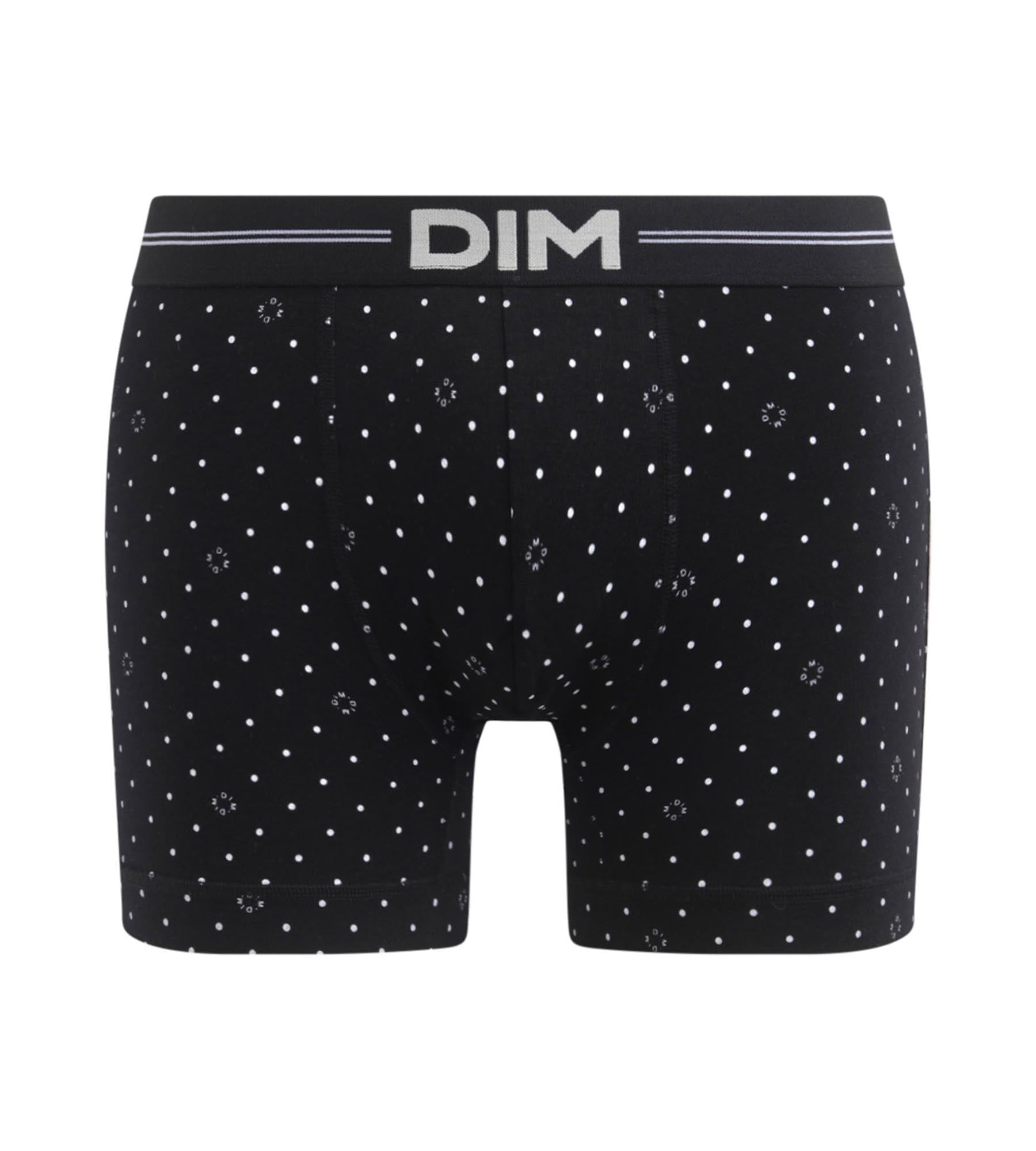 Craquez pour ce boxer dim en coton modal à la fois cosy, avec ses bords plats, et très actuel, avec son design graphique ! Conçu avec une zone avant doublée et une ceinture jacquard élastique, le boxer pour homme Dim Icons Essentiel vous maintient parfaitement, sans gêner votre mobilité. On adore le logo Dim décliné en imprimé, et les pois blancs, iconiques !