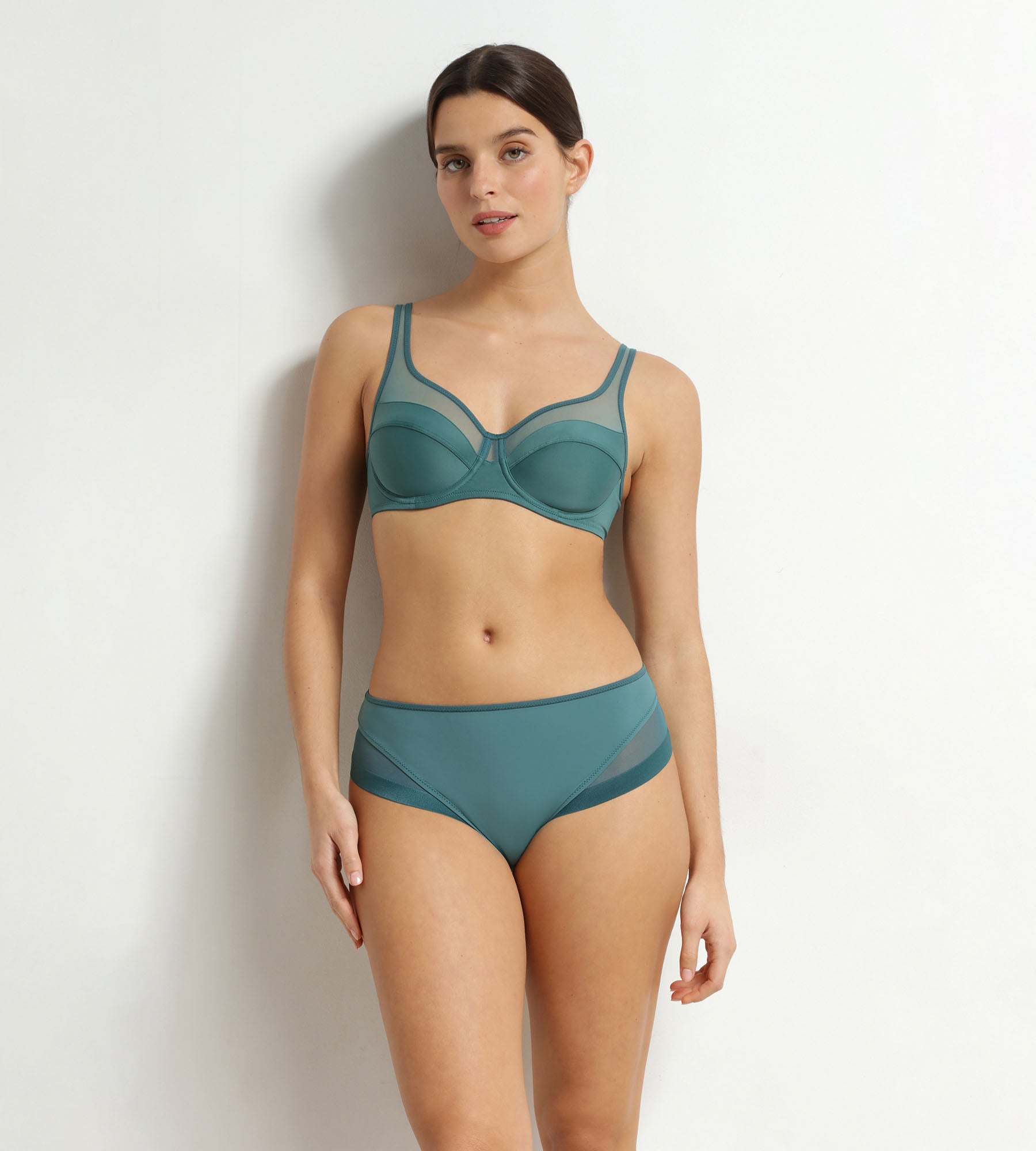 Entre confort et sensualité, la culotte femme Dim Generous en microfibre et tulle Vert Émeraude séduit par sa teinte chic et précieuse.