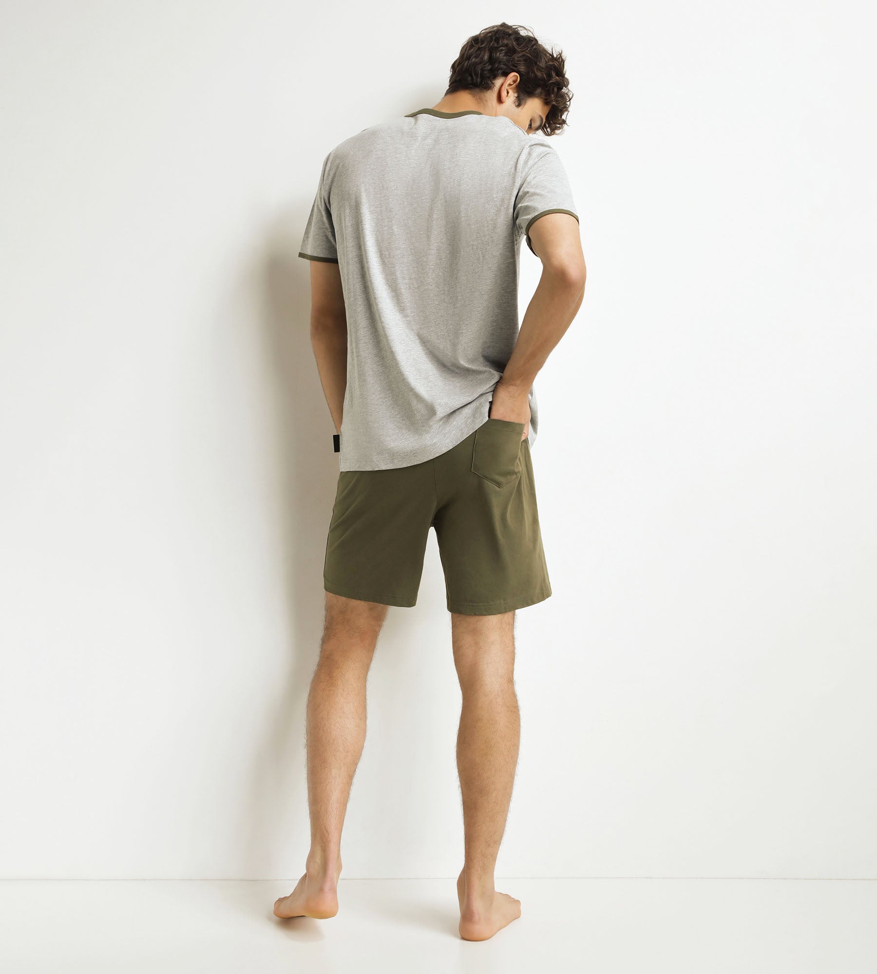 Découvrez l’ensemble pyjama short homme Dim Jersey en gris chiné et kaki, léger et intemporel, à porter de jour comme de nuit !