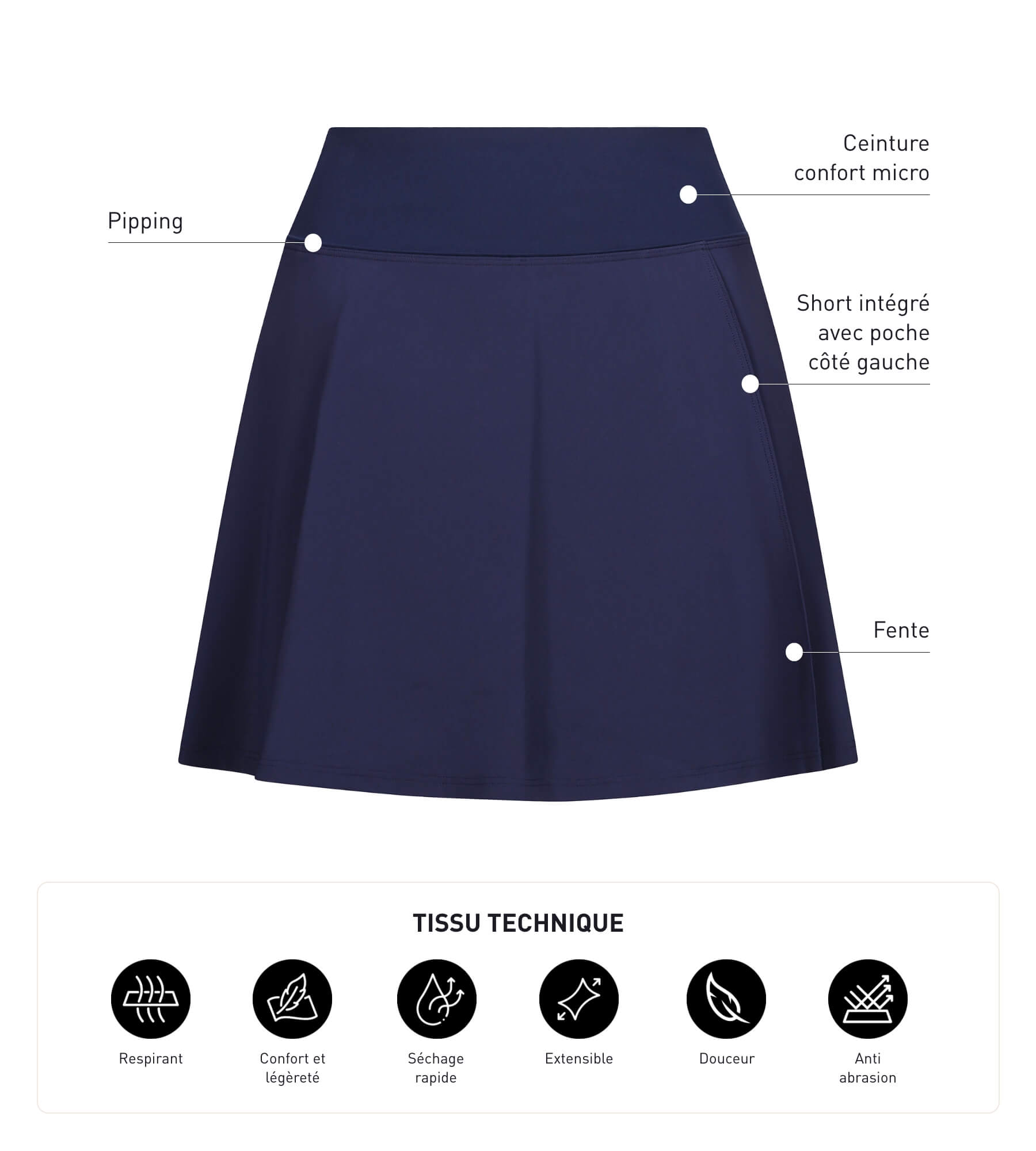 Conçue pour conjuguer allure sportive et liberté totale, la jupe short en microfibre Bleu Nuit Dim Move est votre atout performance !