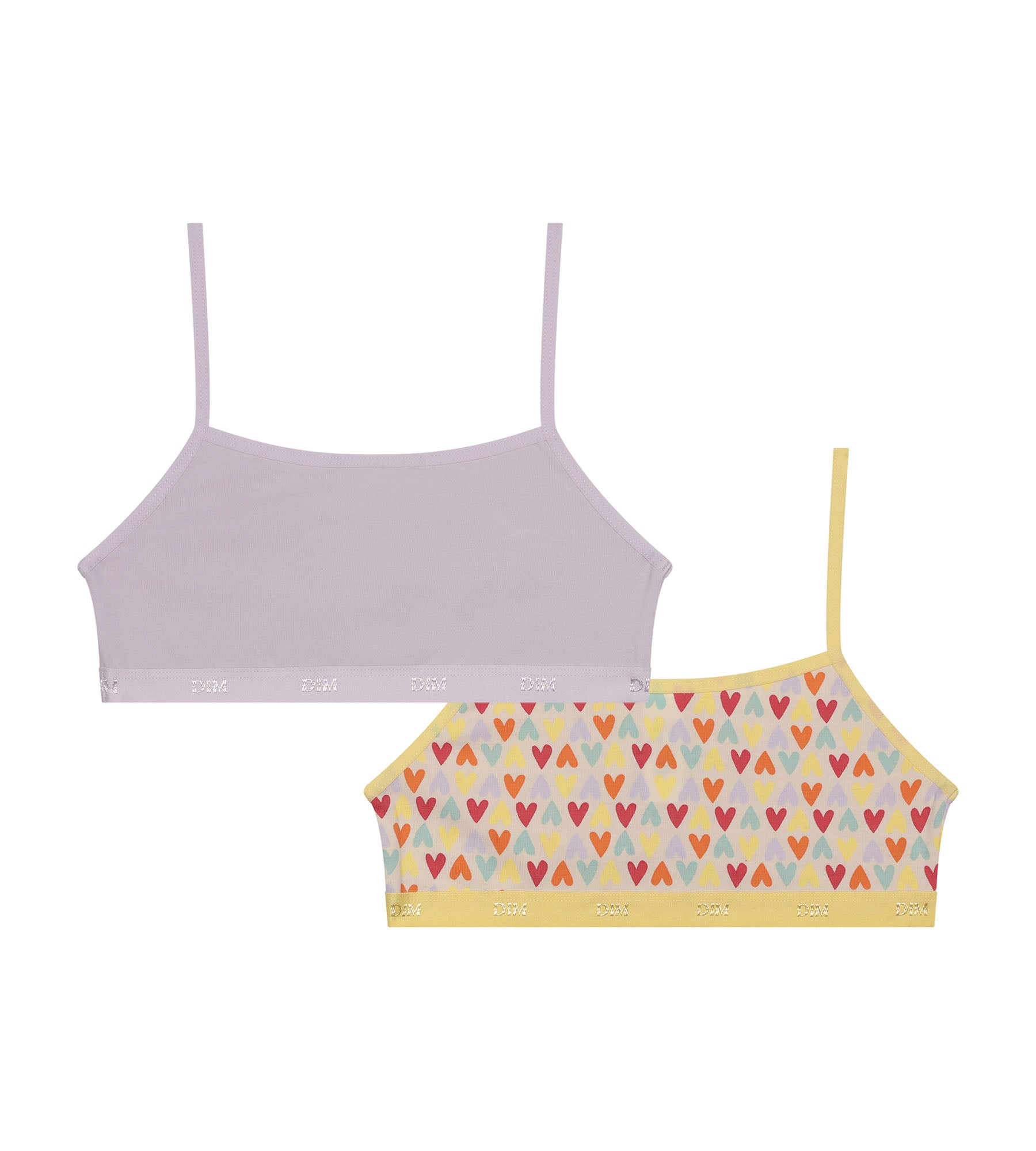 Pour une journée tout en confort et en peps, découvrez le lot de 2 brassières fille en coton stretch jaune et lila Les Pockets à motif cœur !