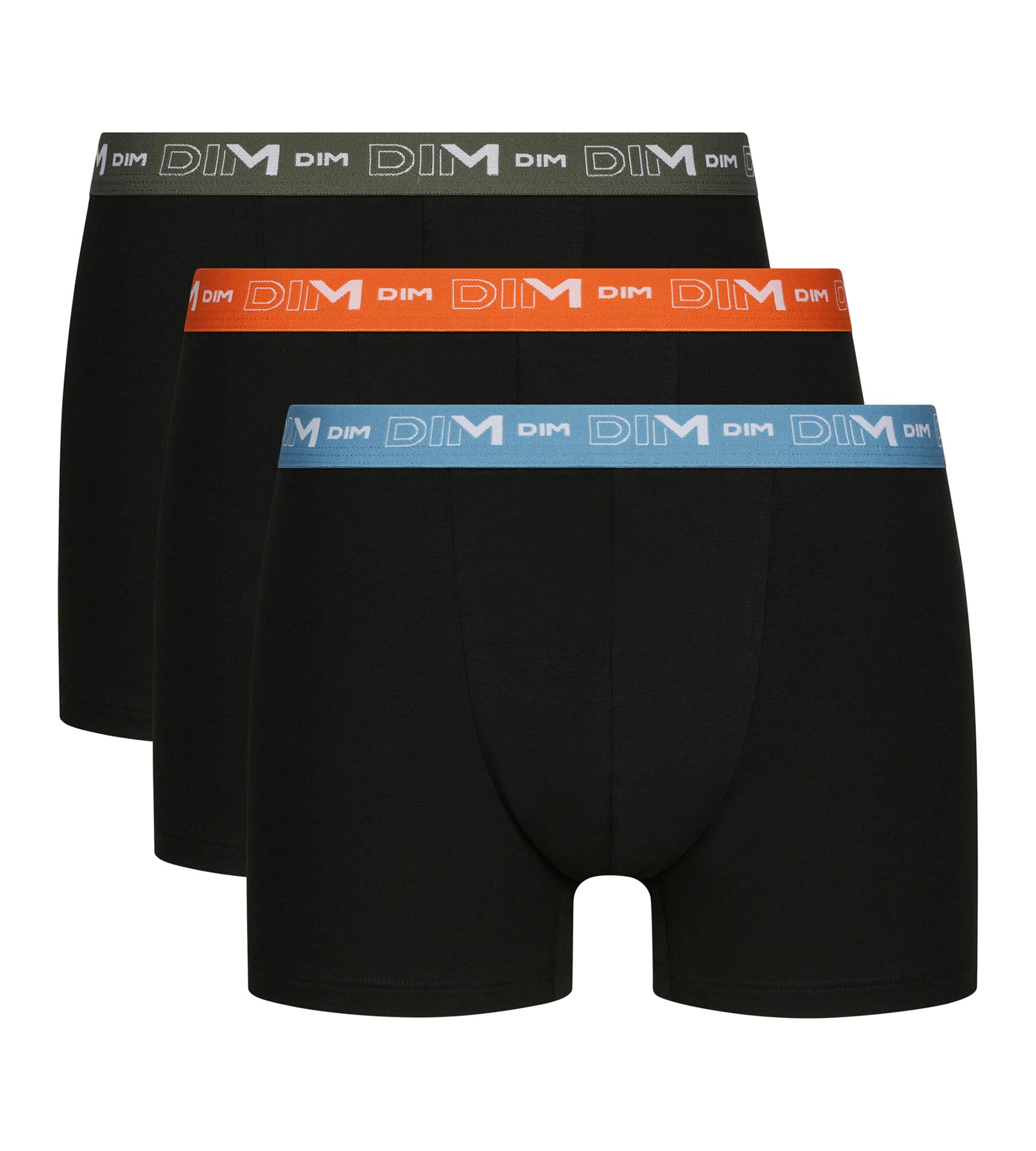 Misez sur le confort et la couleur avec le lot de 3 boxers pour homme Dim Coton Stretch noir, à la ceinture bleue, orange et verte !