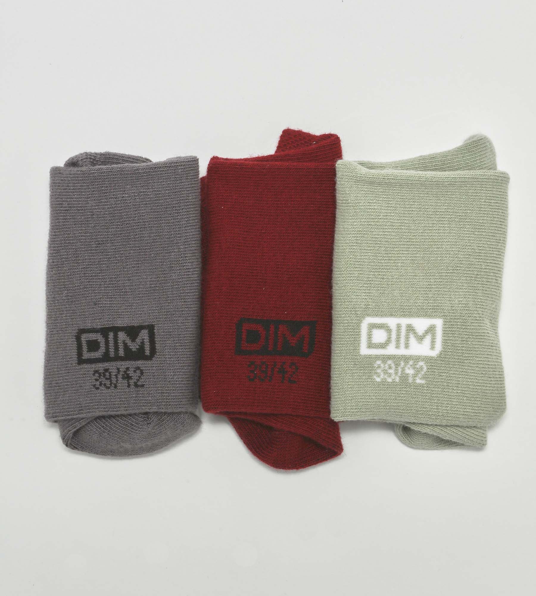 Découvrez les déclinaisons Grises, Rouge et Sauge de notre lot de 3 paires de chaussettes courtes homme Dim Coton !