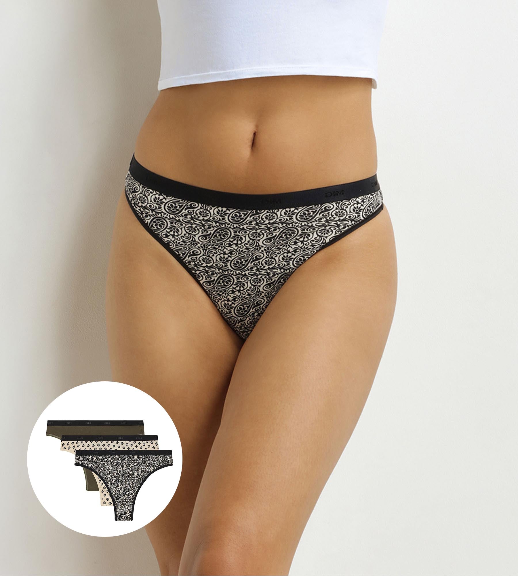 Ce lot de 3 strings femme de la gamme Dim Les Pockets est parfait pour renouveler ses basiques avec style. Entre le modèle noir à imprimé cachemire, le string beige à motifs géométriques noirs et le modèle uni kaki, chaque pièce apporte sa dose de caractère. Grâce à leur coupe invisible et leur matière extensible en coton, ces strings pour femmes se glissent facilement sous tous vos bas, avec aisance.