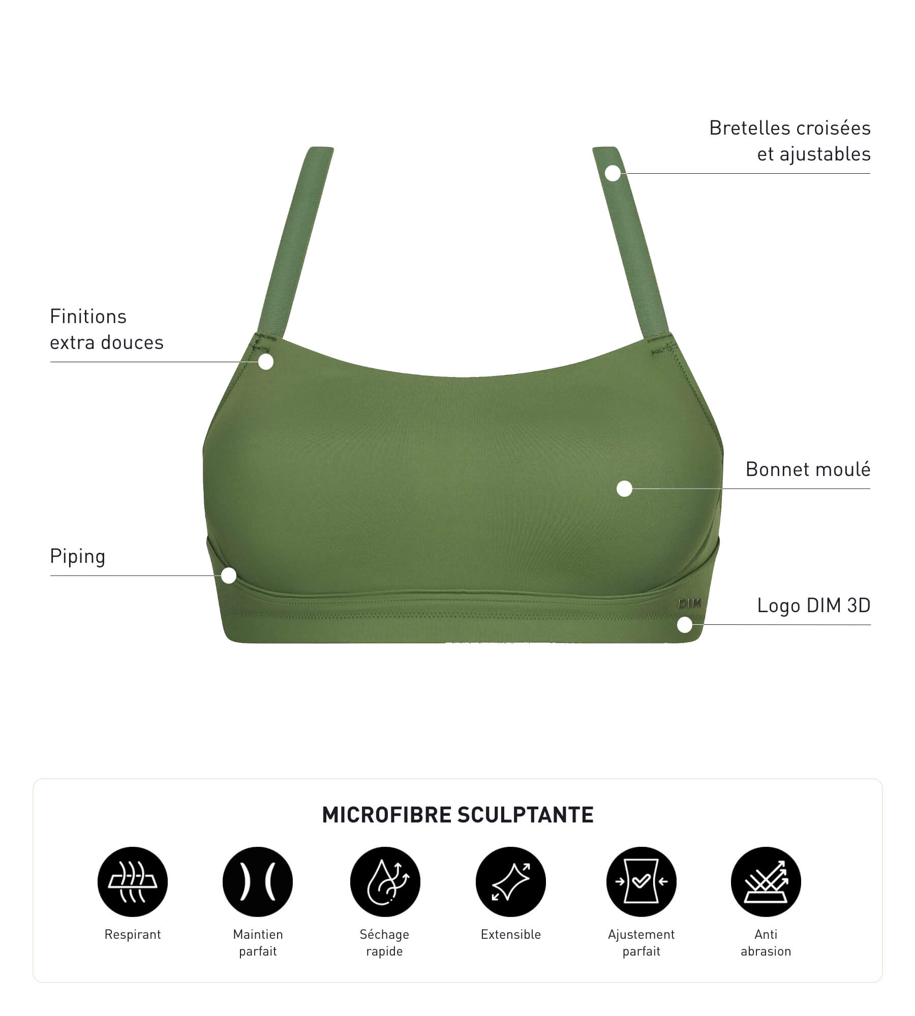Confortable et sculptant, adoptez le soutien-gorge de sport sans armature Dim Move en microfibre Kaki !