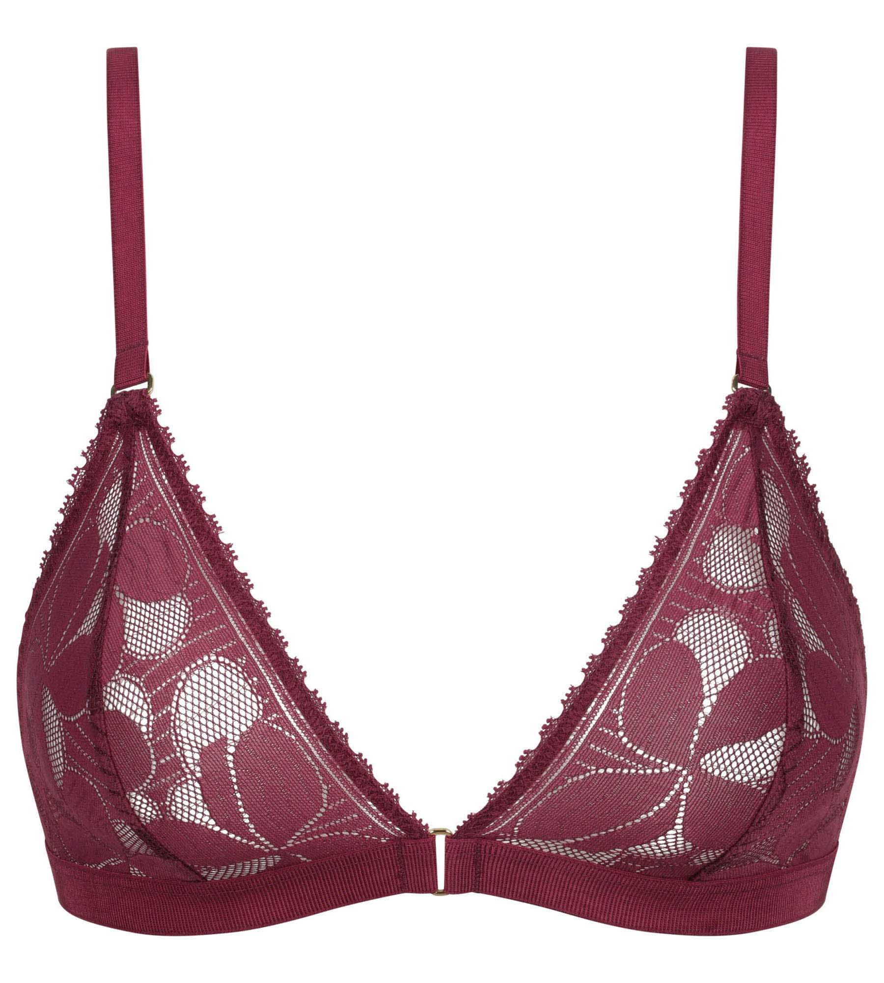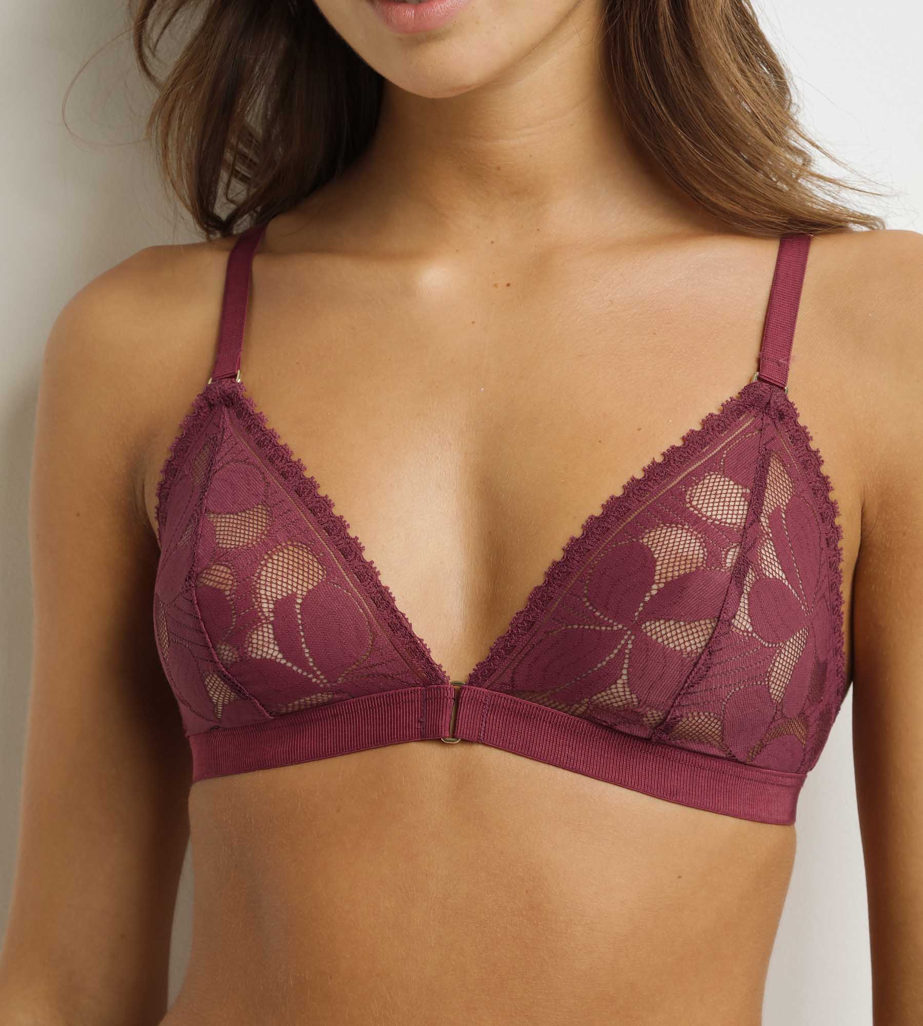 Léger et sophistiqué, craquez pour le soutien-gorge triangle sans armatures en dentelle Art Flower de Dim au coloris Figue intense.