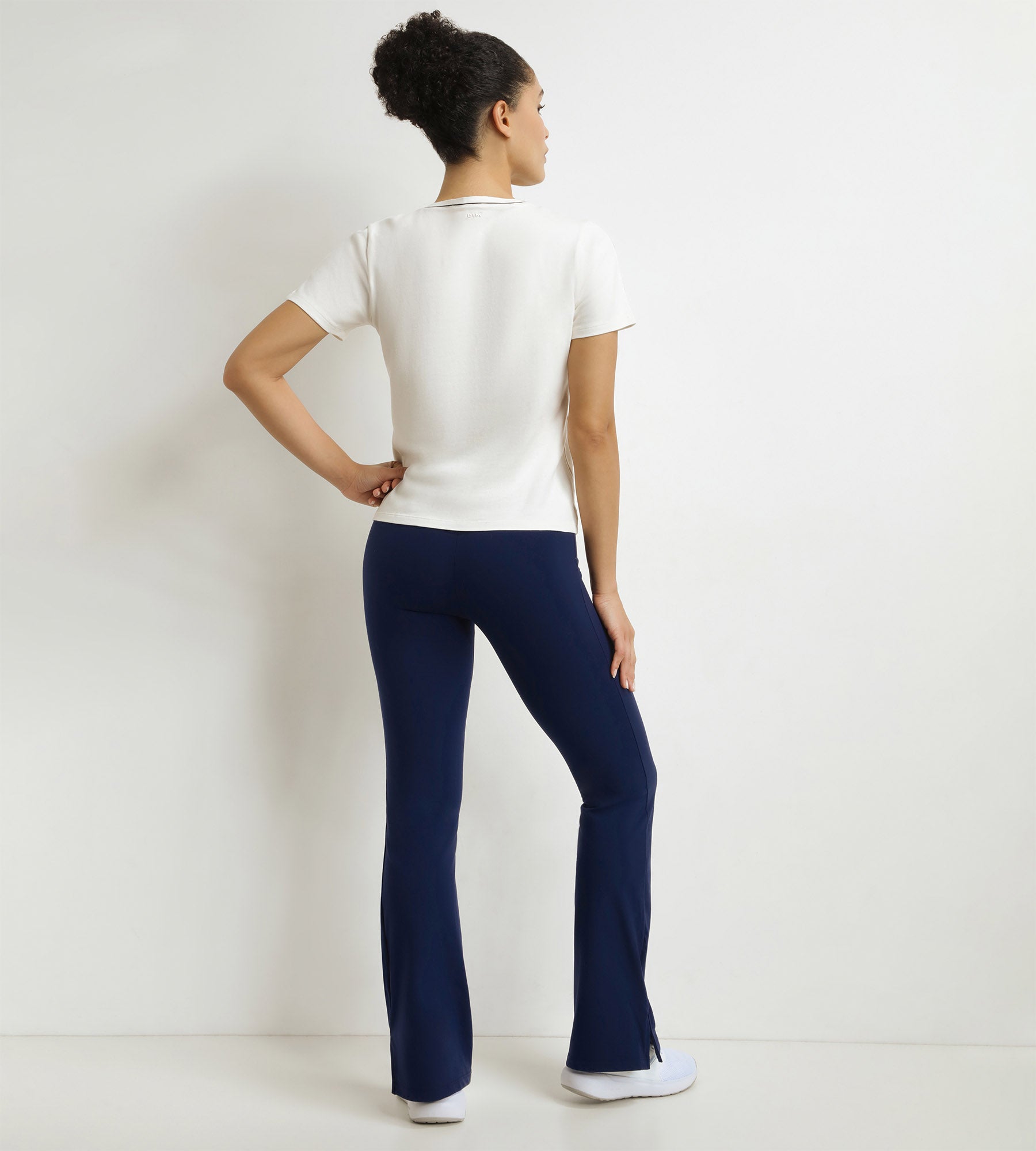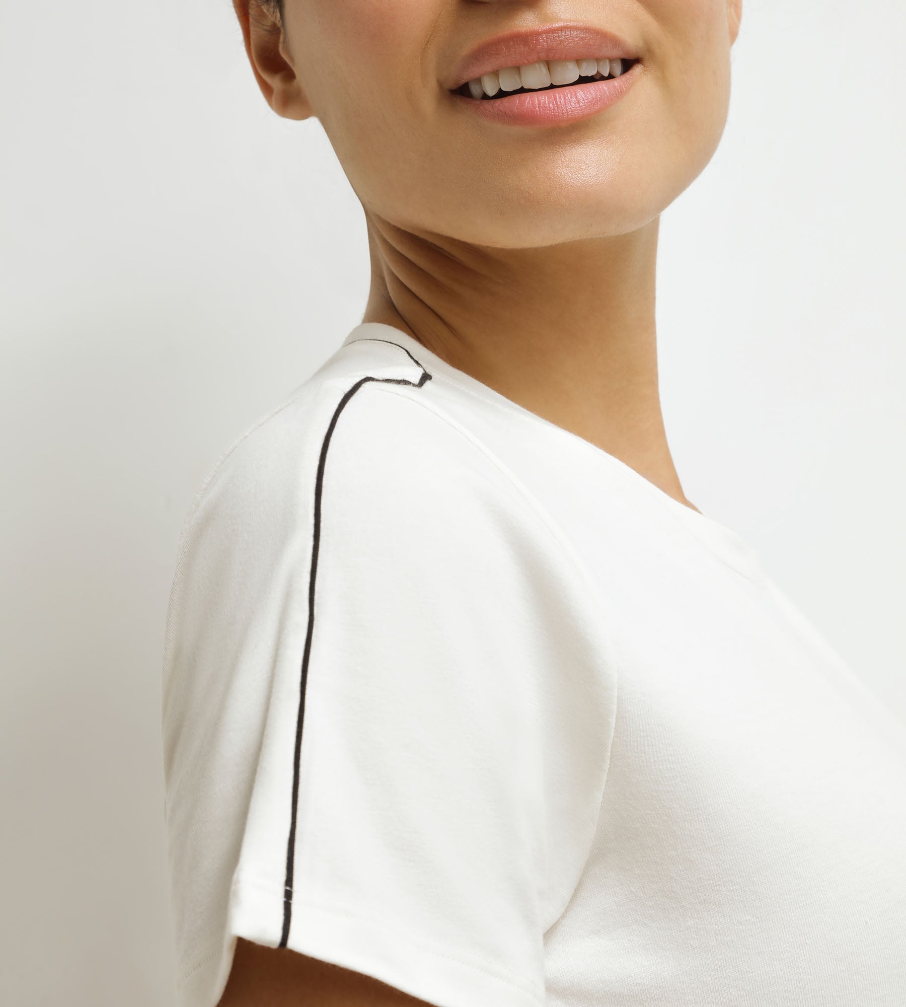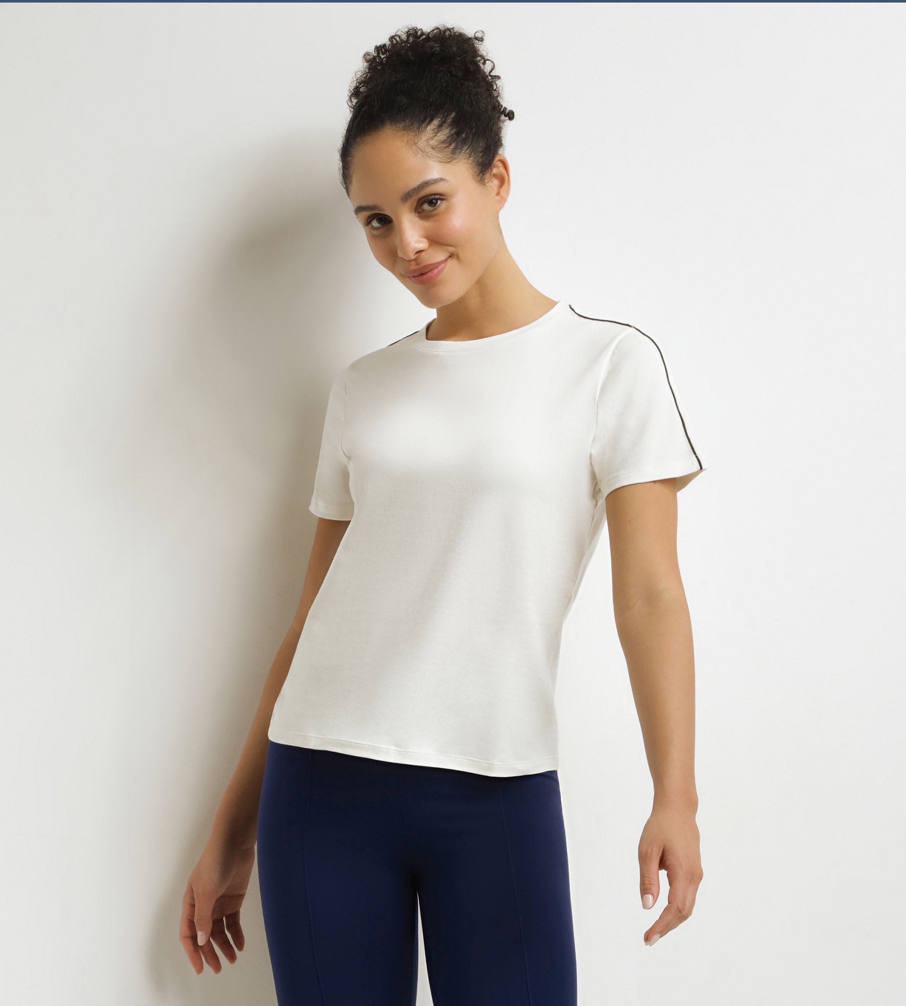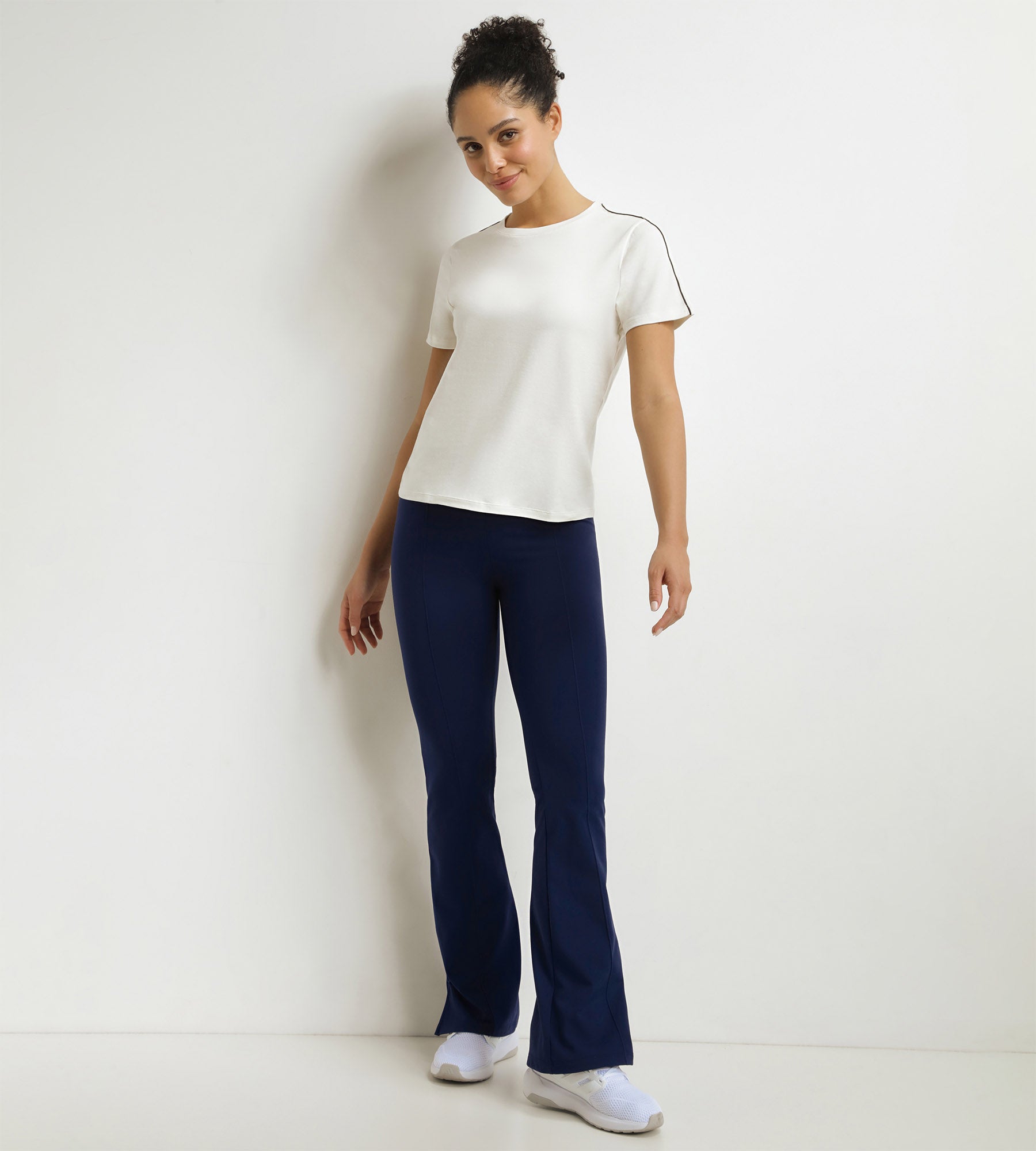 - Le coloris Écru avec piping noir, sobre et athlétique