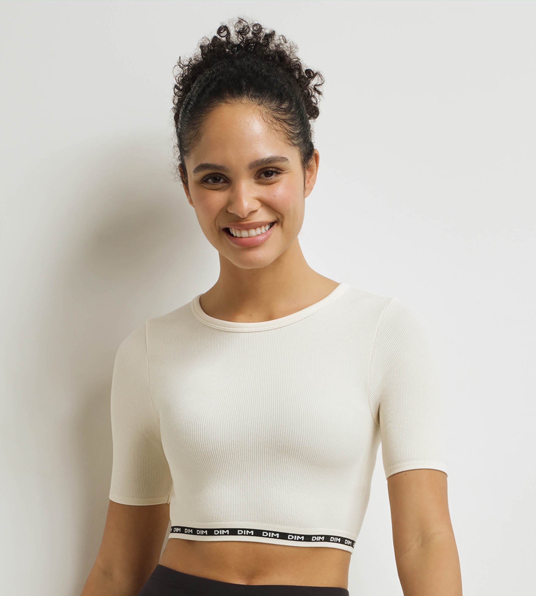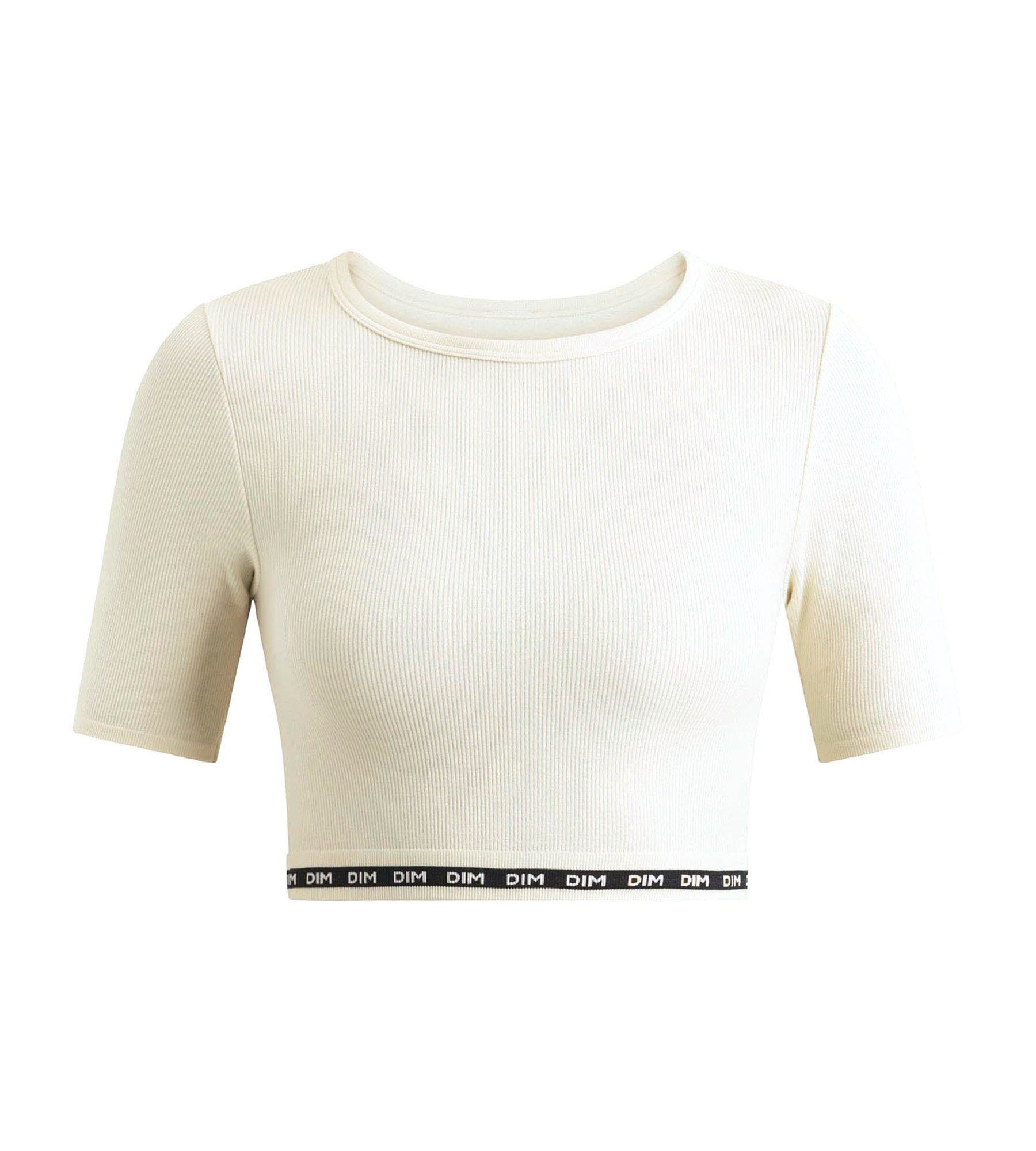 Craquez pour l’allure épurée et dynamique du t-shirt femme Dim Icons Seamless, en microfibre côtelée Beige au détail graphique noir !
